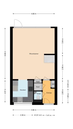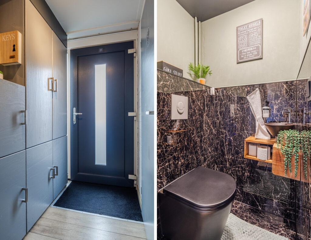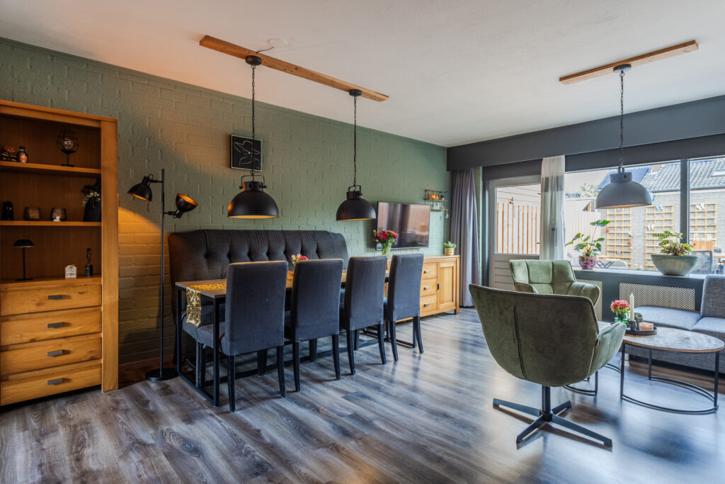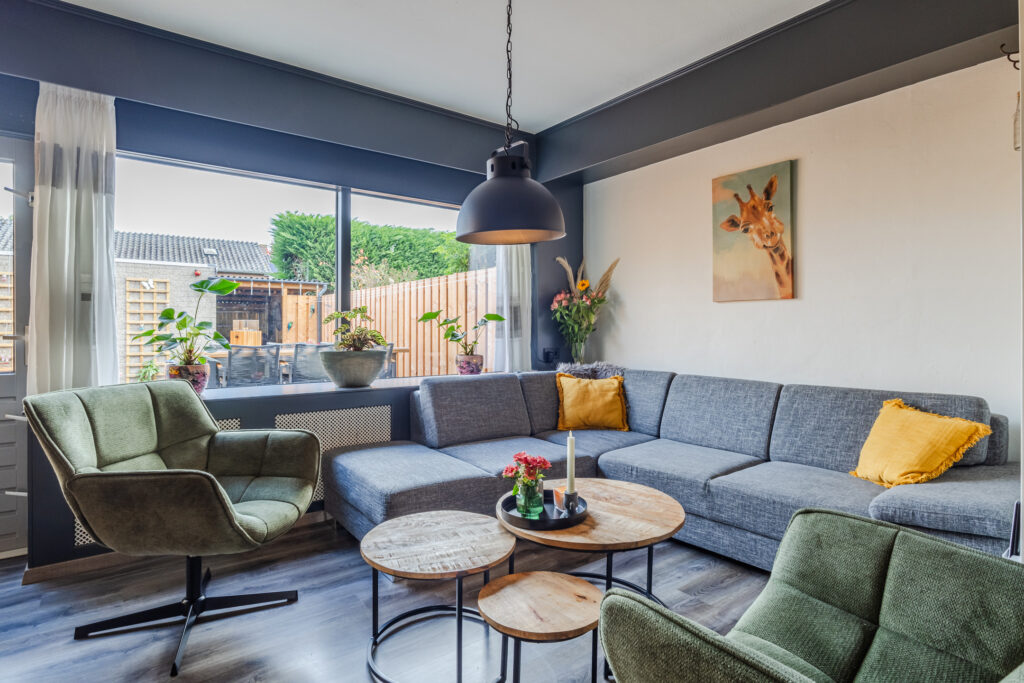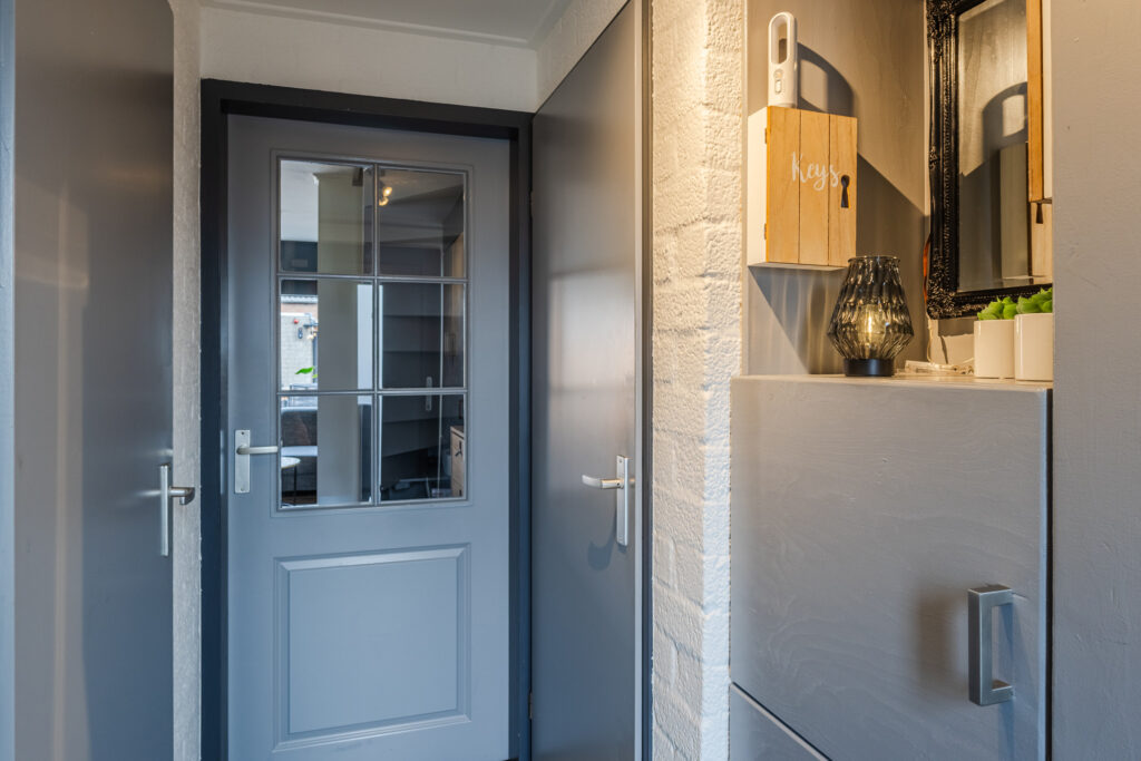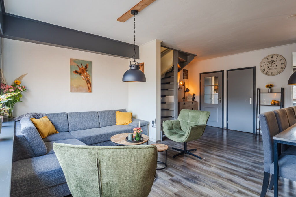 Entree/hal met meterkast, toilet (vernieuwd in 2025) en praktische bergkast. De ruime, lichte woonkamer heeft een fijne zithoek aan de achterzijde en een trapopgang naar de eerste verdieping.