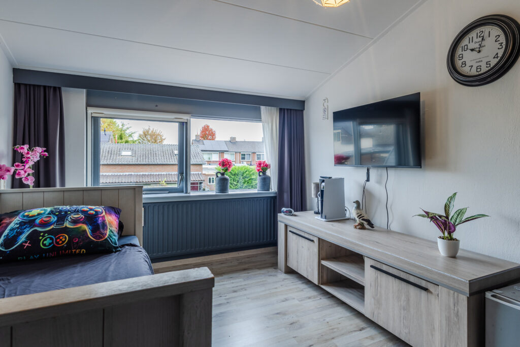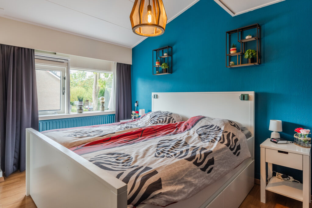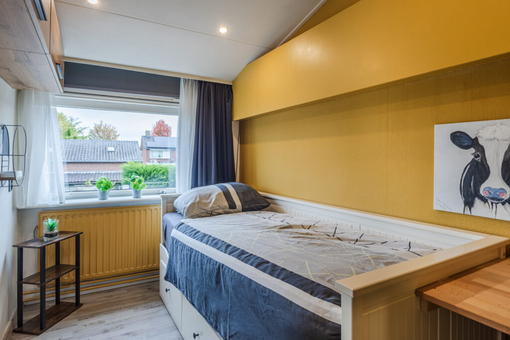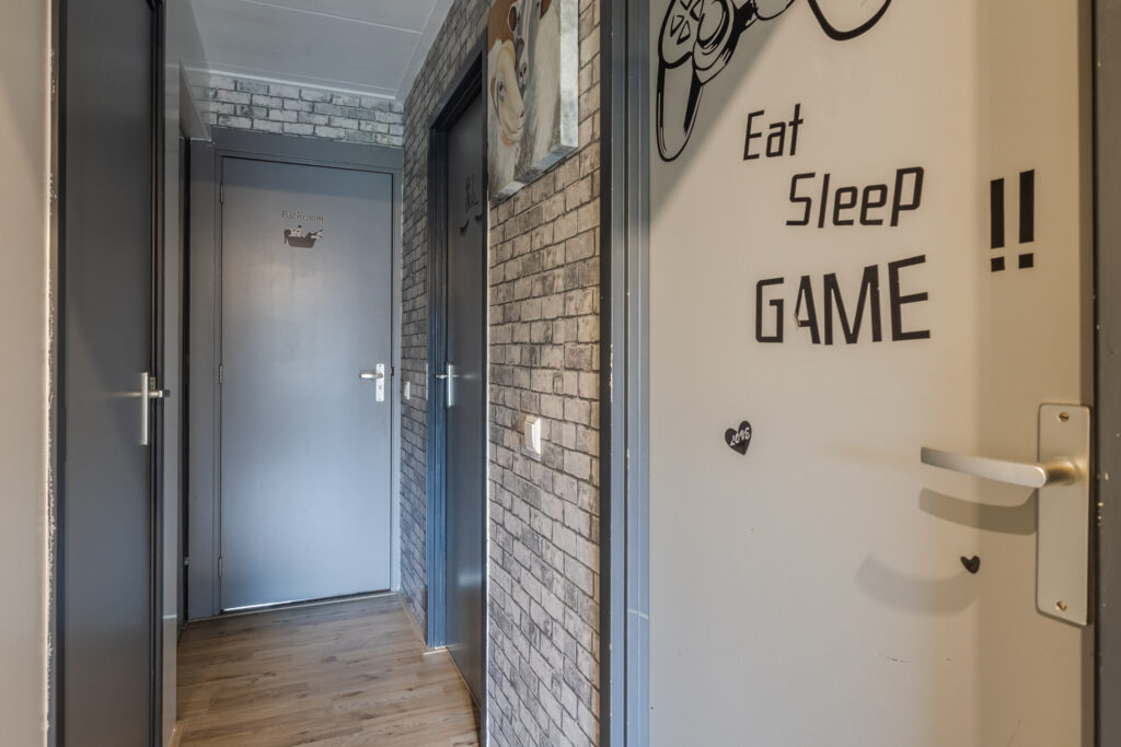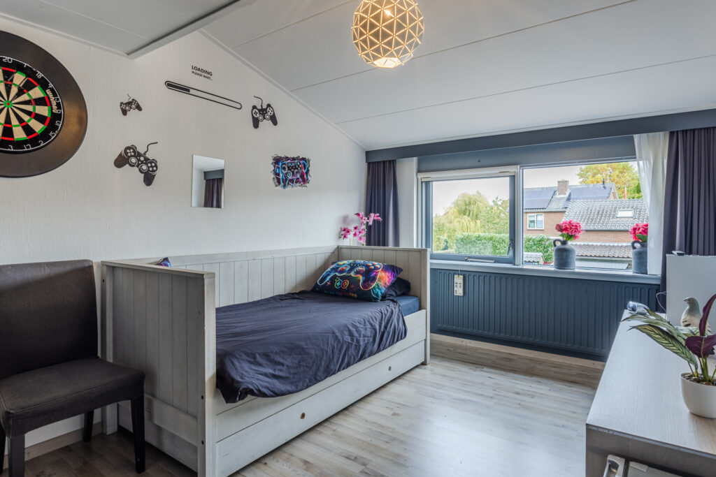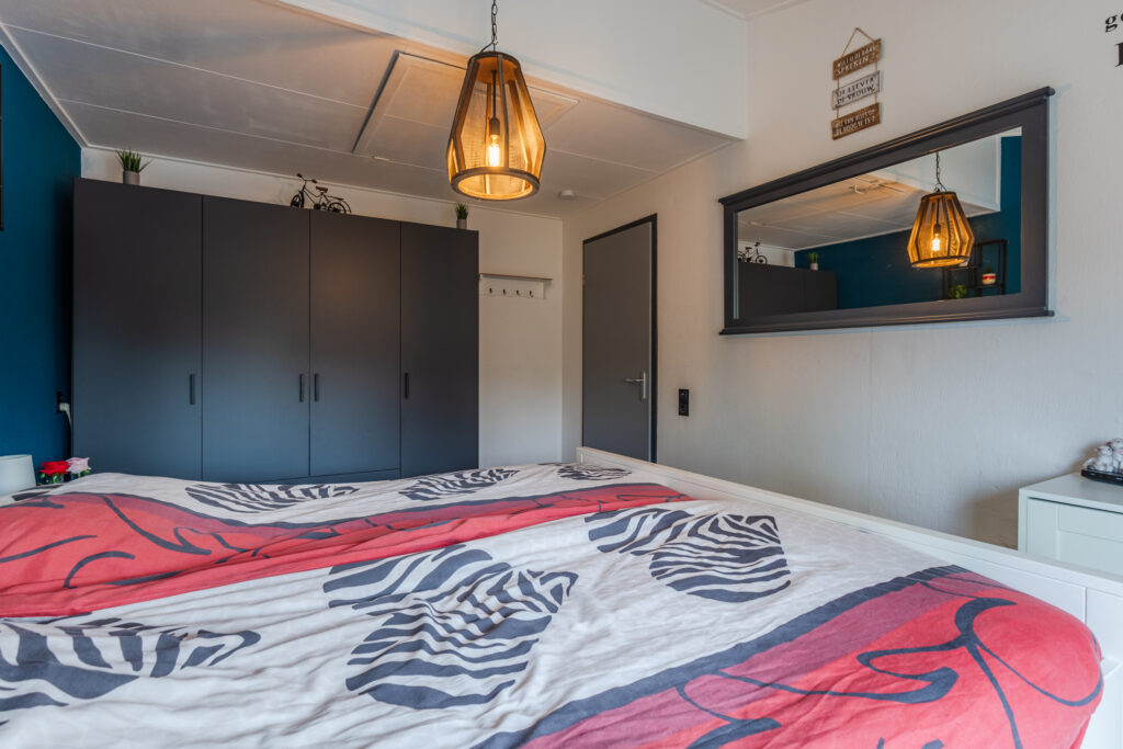De overloop biedt toegang tot drie slaapkamers en de moderne badkamer. Twee slaapkamers beschikken over een vlizotrap naar een kleine vliering, ideaal voor extra bergruimte. De badkamer voorzien van een inloopdouche (2025), stijlvol wastafelmeubel en aansluiting voor witgoed. Op de overloop bevindt zich bovendien een cv-/bergkast.