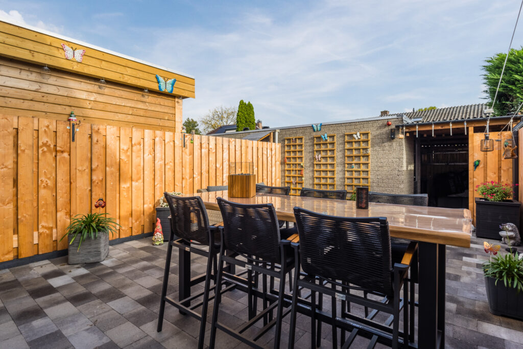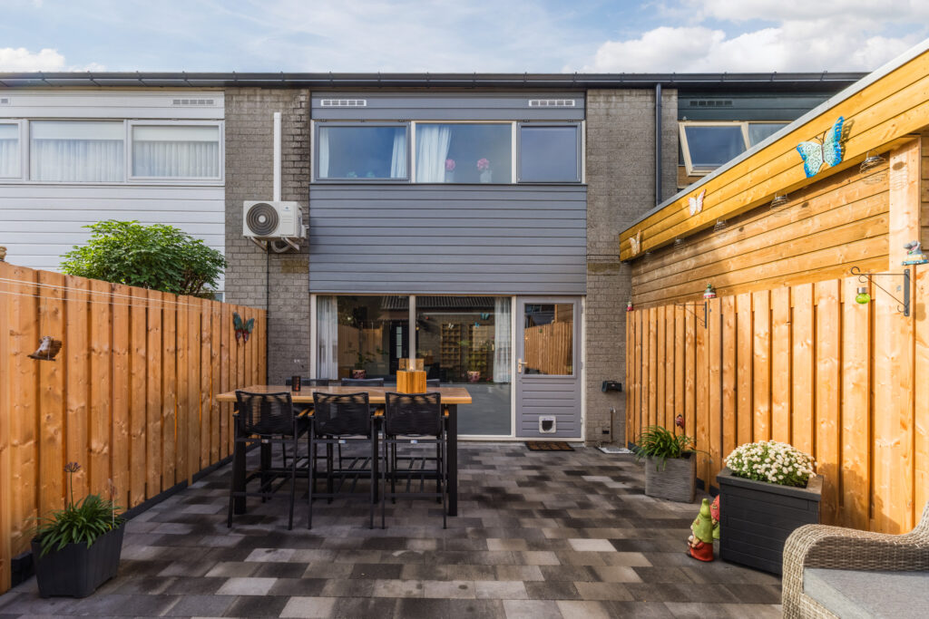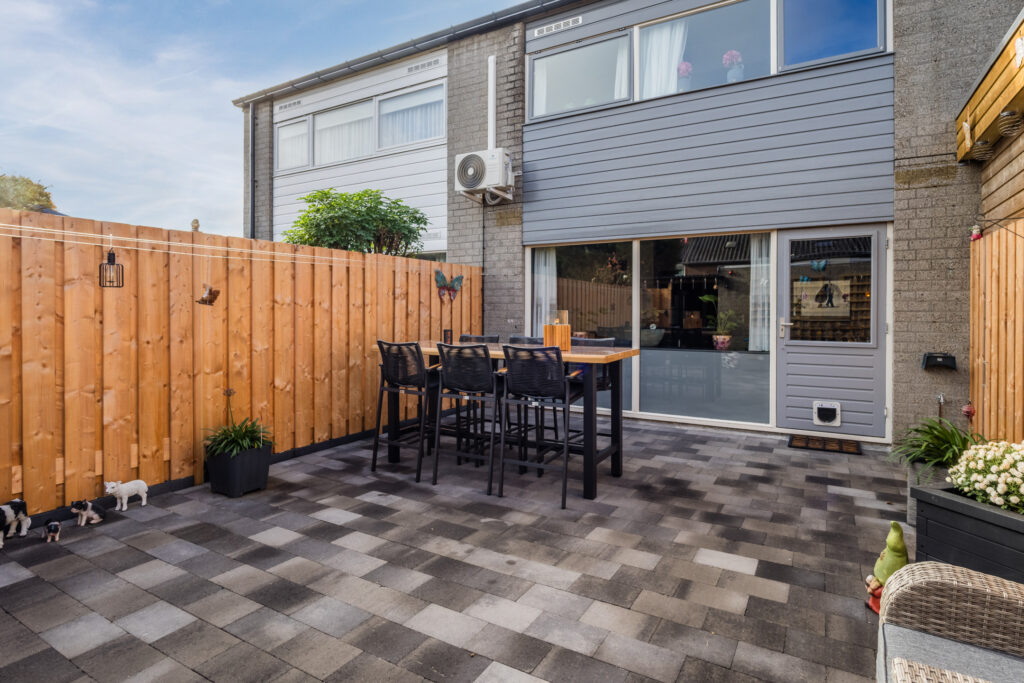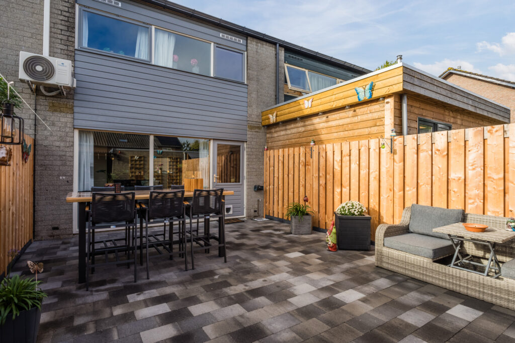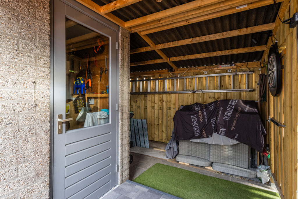 De achtertuin met achterom is gelegen op het noordoosten en is keurig en onderhoudsvriendelijk aangelegd met sierplanten en bestrating. Achterin de tuin vind je een stenen berging met overkapping, perfect om fietsen droog te stallen.