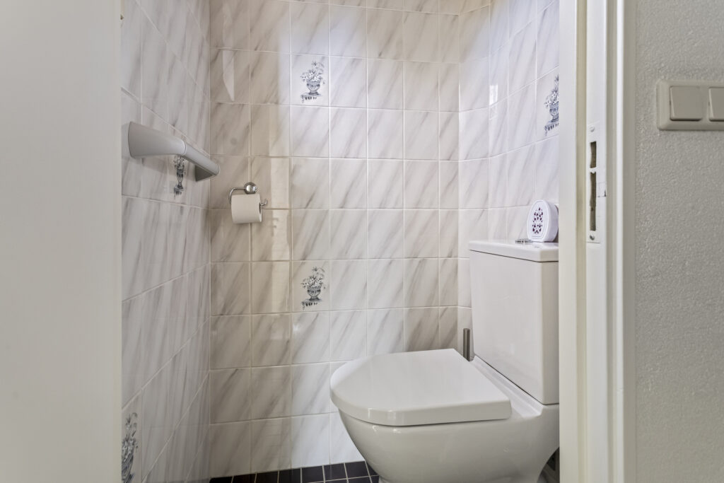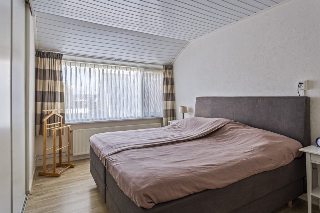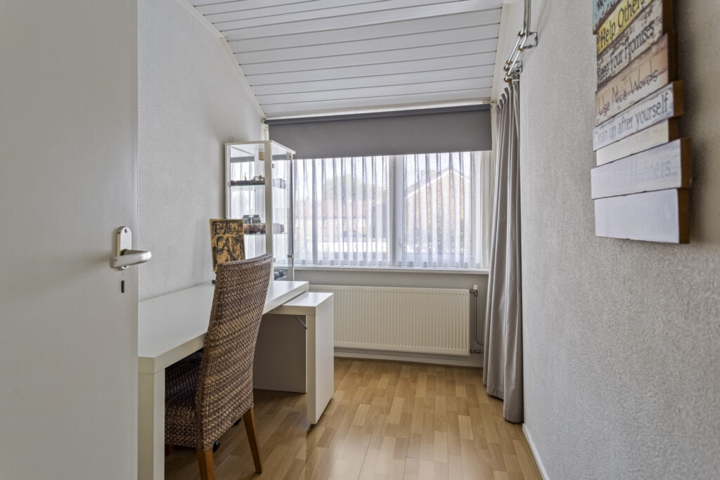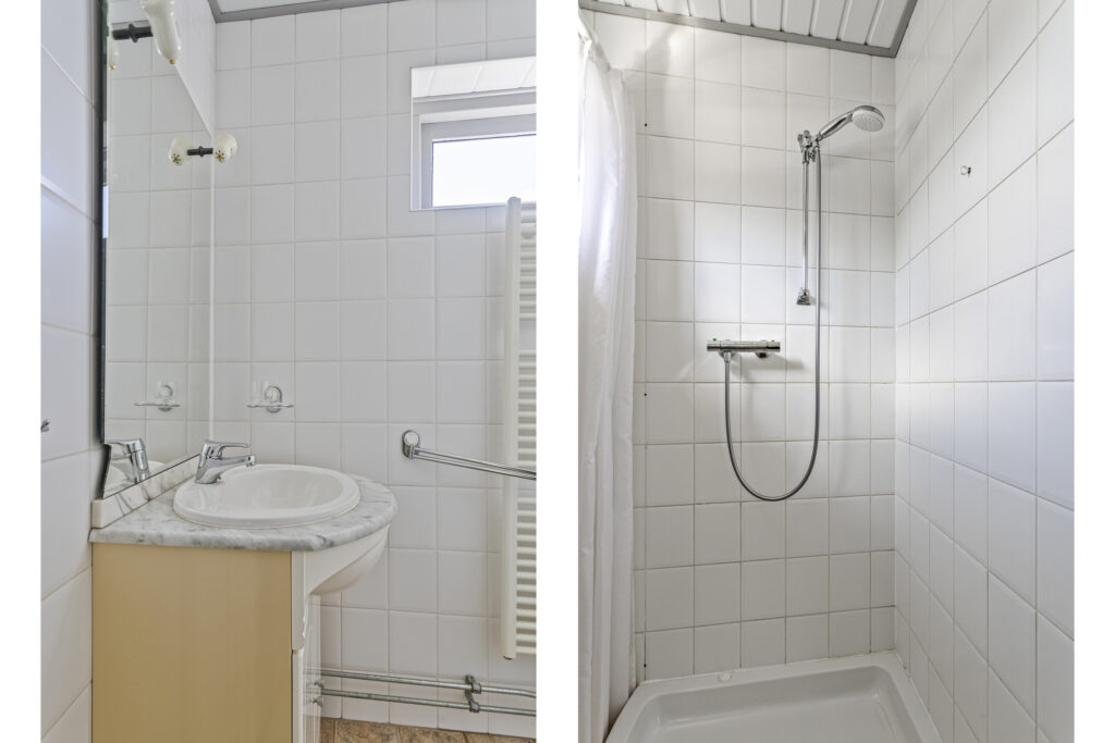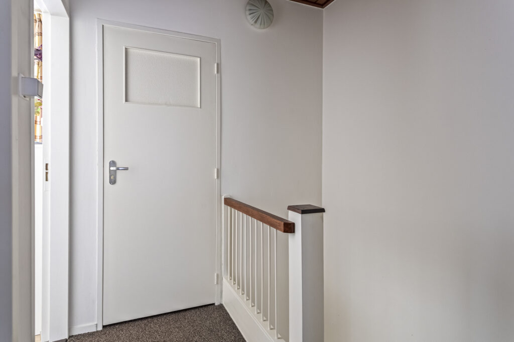 Op de eerste verdieping bevinden zich drie slaapkamers, waarvan één met een vaste kast. De badkamer is praktisch ingericht met douche en wastafel. Via de overloop is er een luik naar de bergzolder met cv-opstelling.