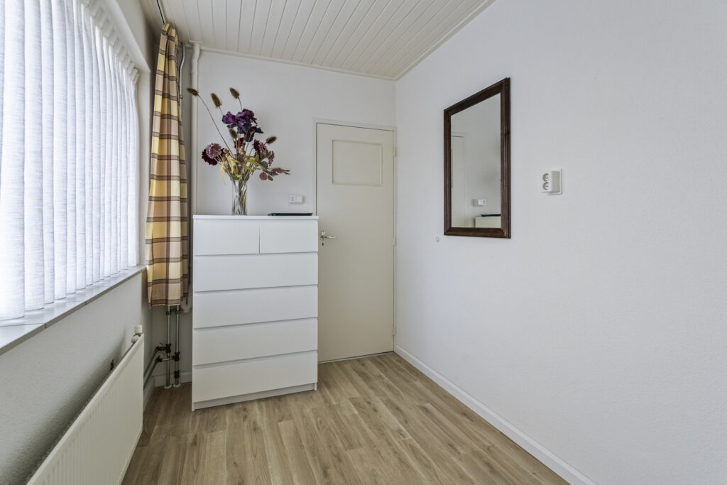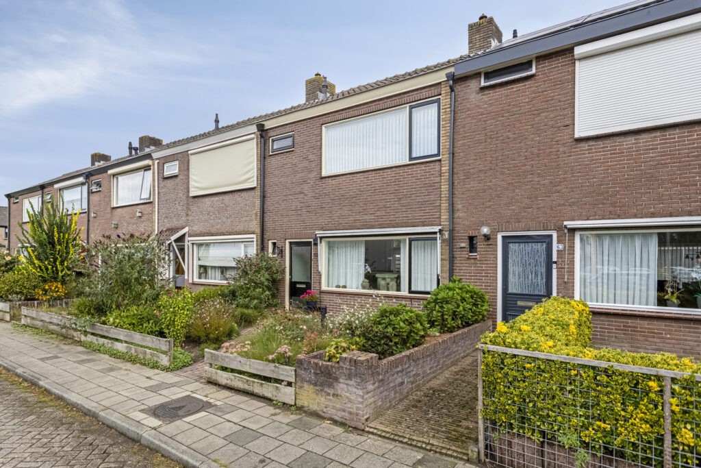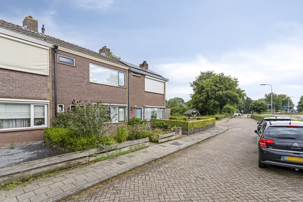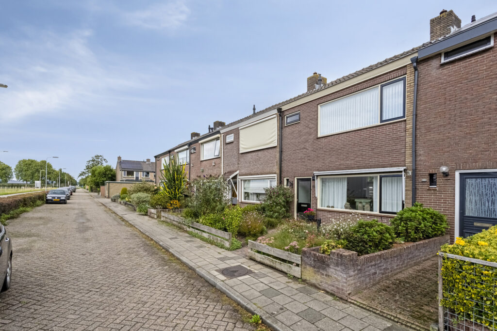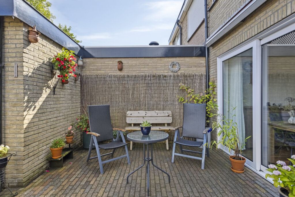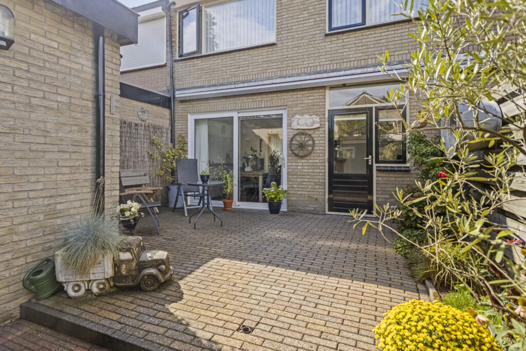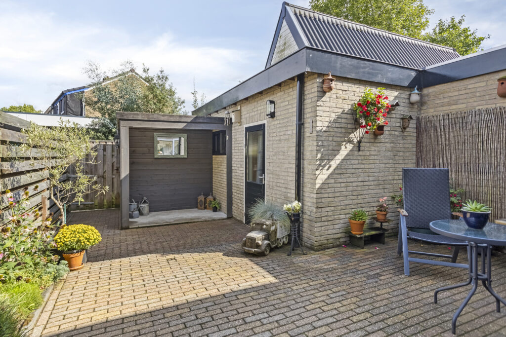 De achtertuin op het oosten is netjes aangelegd met vaste beplanting en een achterom. Achterin staat een ruime berging met witgoedaansluiting en twee overkappingen, ideaal voor onder andere de kliko’s of tuingereedschap. Parkeren kan openbaar voor de deur.