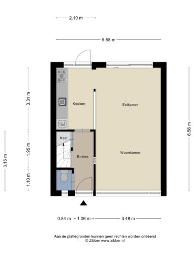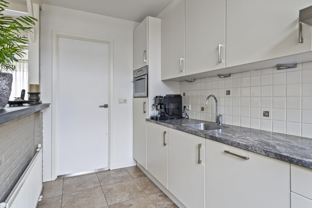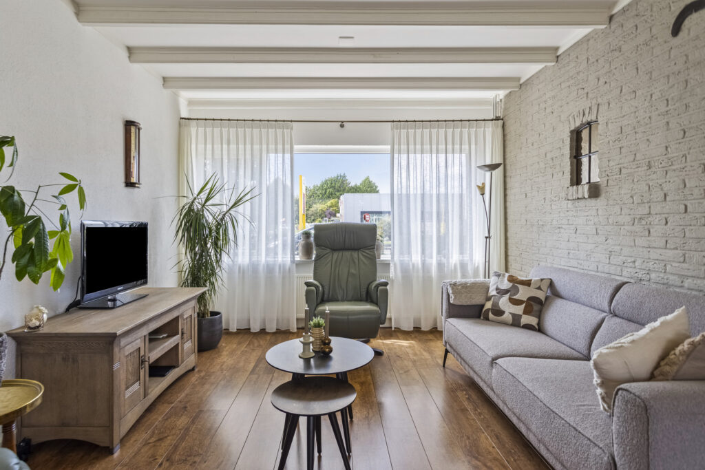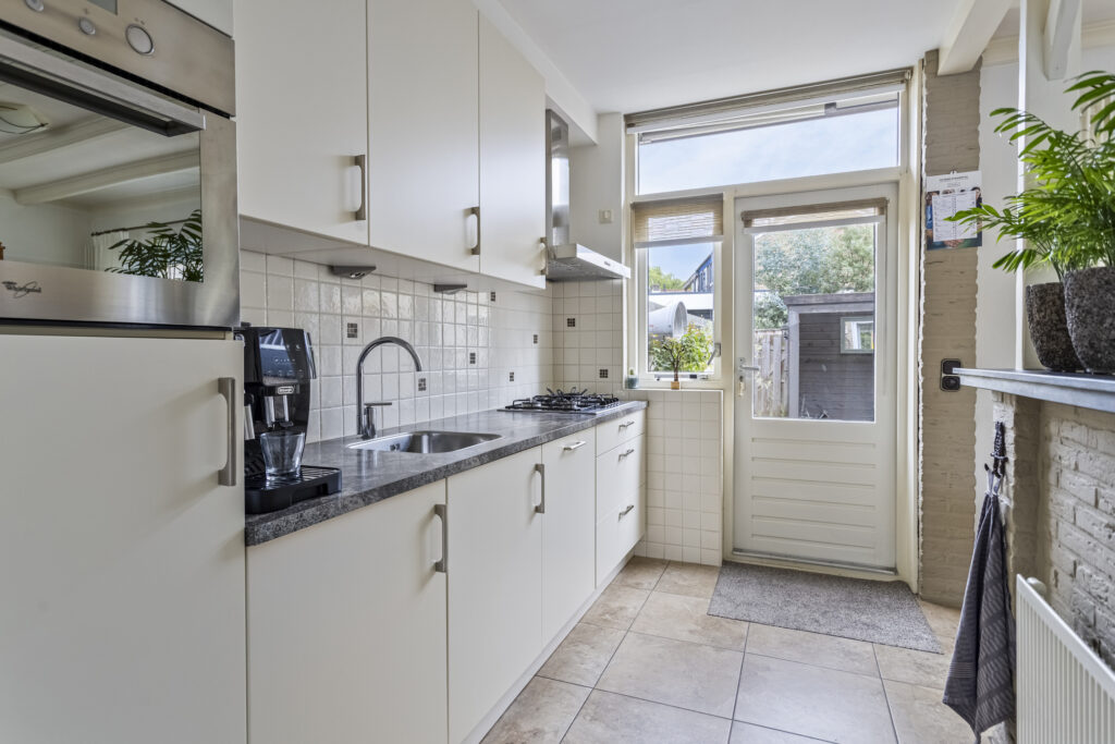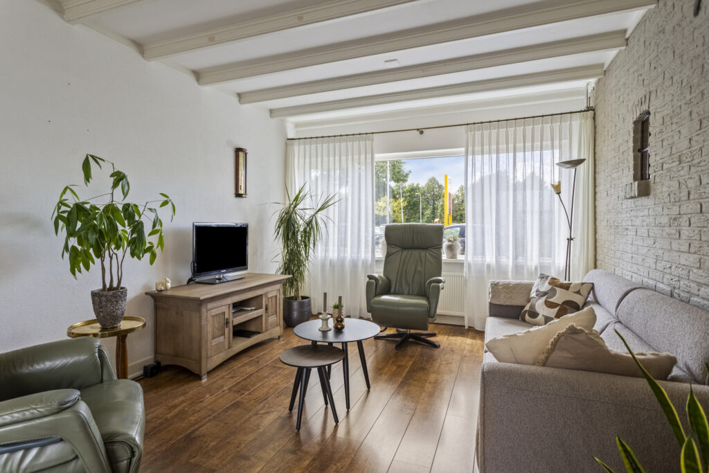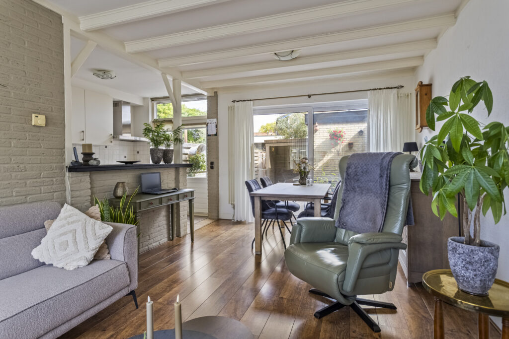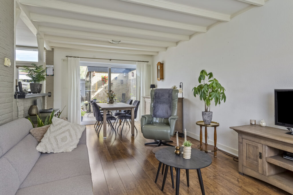 Bij binnenkomst treft u de hal met toilet, meterkast en de trapopgang naar de verdieping. De lichte doorzonwoonkamer met houten balken en schuifpui naar de tuin biedt een warme en gezellige leefruimte. De halfopen keuken is voorzien van diverse inbouwapparatuur, waaronder een gaskookplaat, afzuigkap, combi-oven, koelkast en vaatwasser. Vanuit de keuken is er een directe toegang tot de achtertuin.