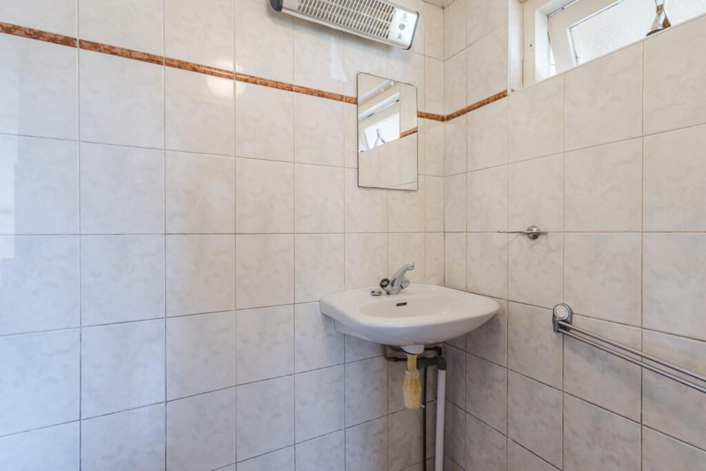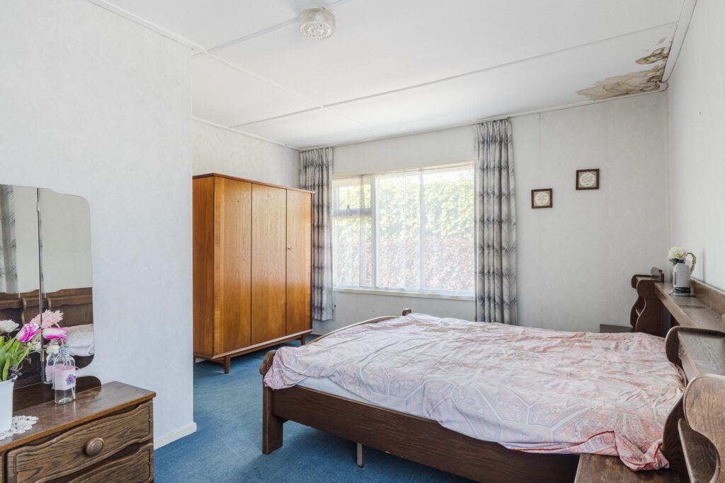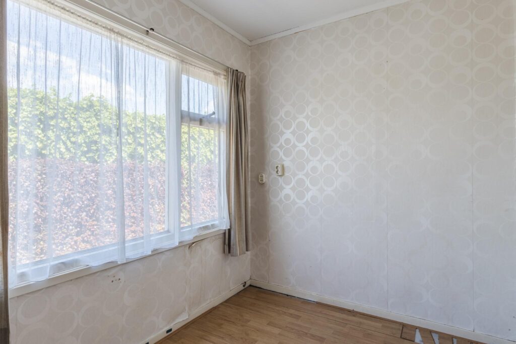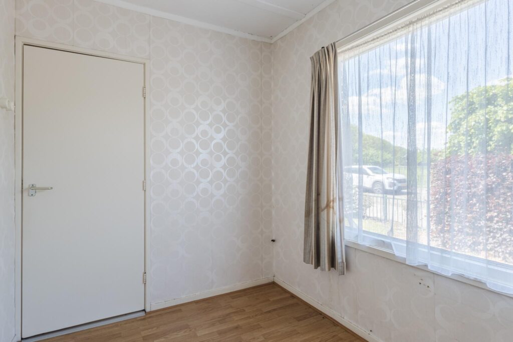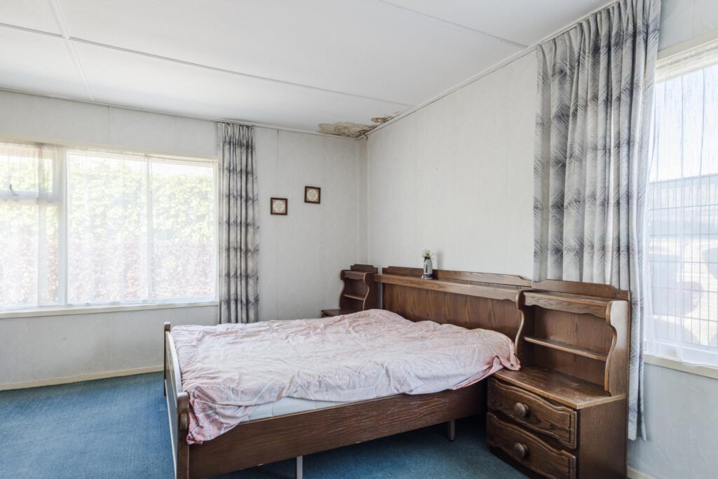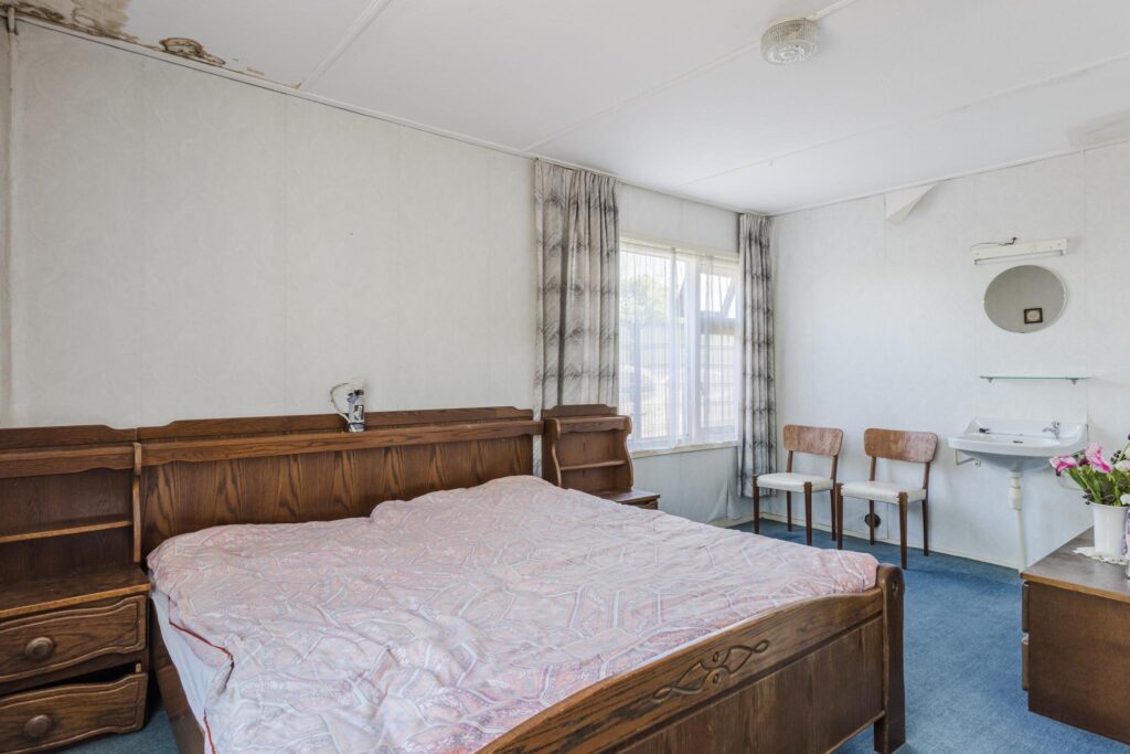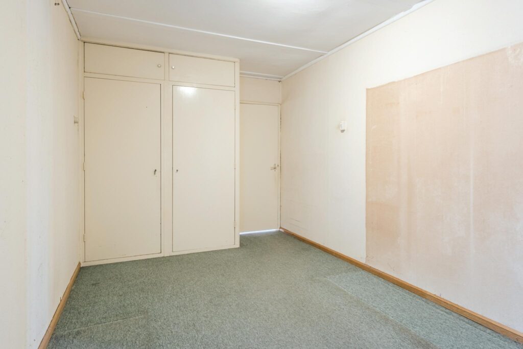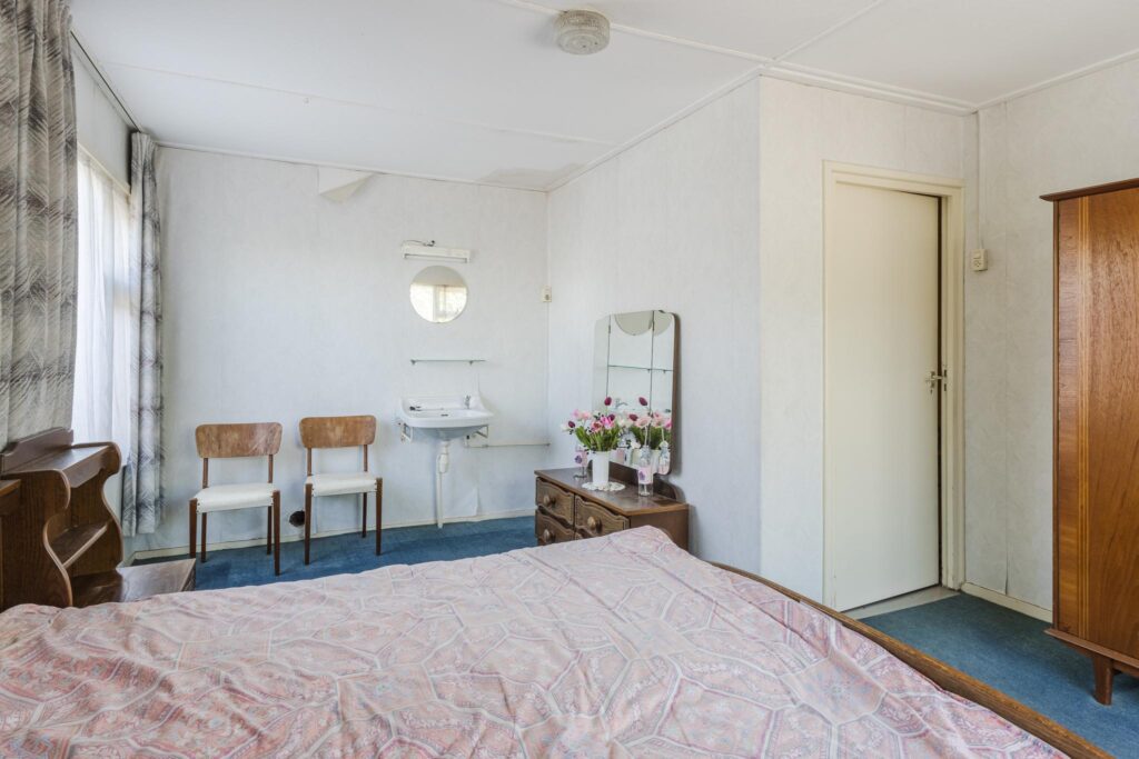 De woning beschikt over twee slaapkamers: één vanuit de entreehal, en een tweede ruime slaapkamer bereikbaar via een tussenruimte die nu dienst doet als hobbykamer. In deze ruimte bevinden zich tevens de witgoedaansluitingen en vaste kasten – ideaal voor extra opbergruimte of een werkplek aan huis.