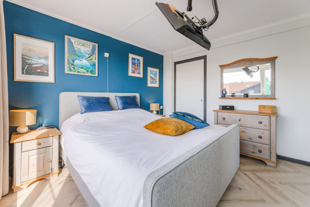 De overloop geeft toegang tot drie slaapkamers, waarvan één beschikt over een dakterras en airconditioning. De badkamer is voorzien van een wastafelmeubel en douche. Via de vaste trap bereik je de tweede verdieping.