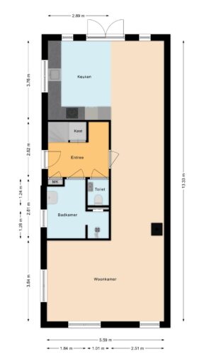 Via de entree komt u in een ruime hal met praktische opbergkast, meterkast en modern toilet. Vanuit hier zijn de badkamer en de woonkamer bereikbaar.