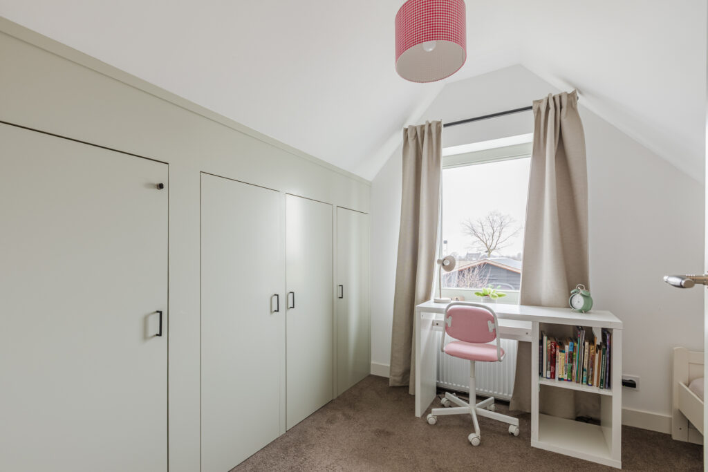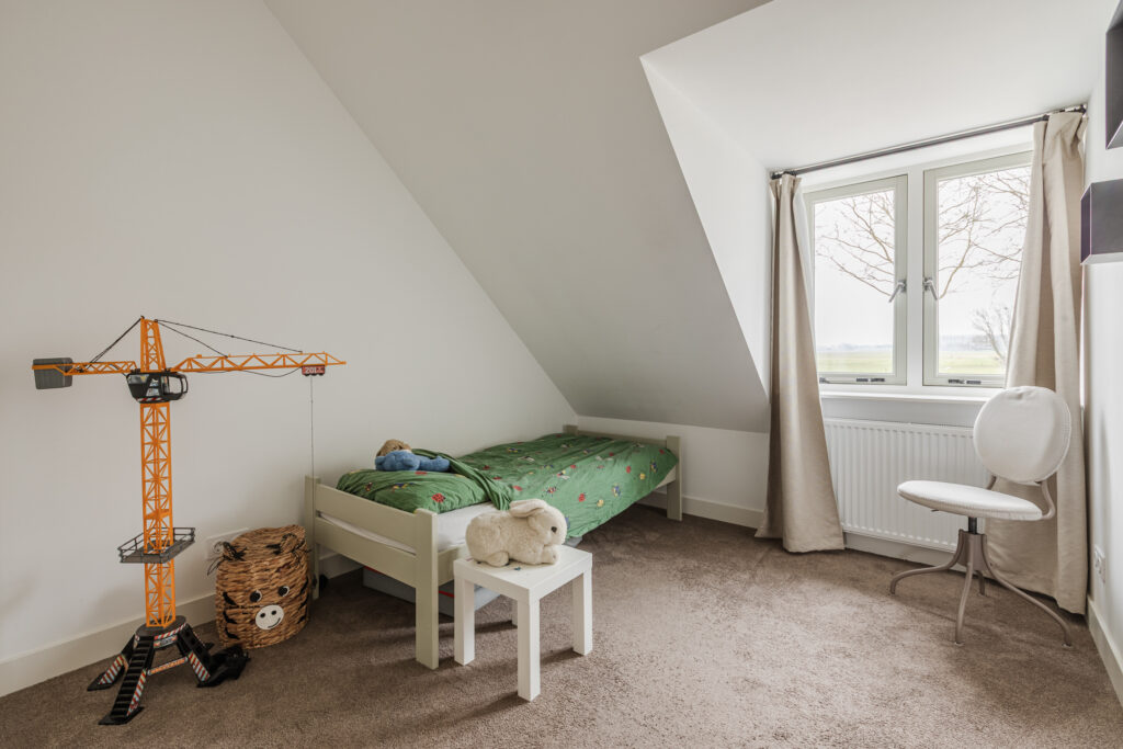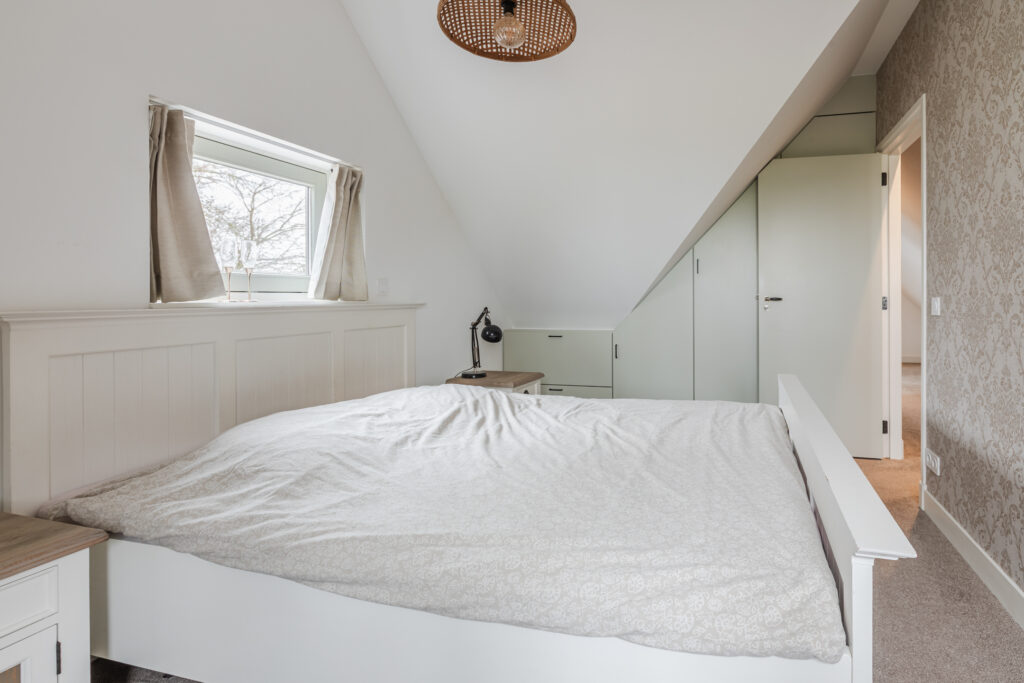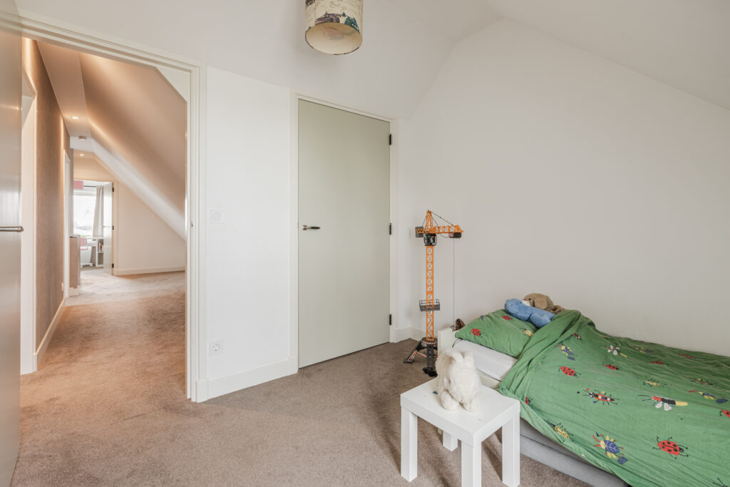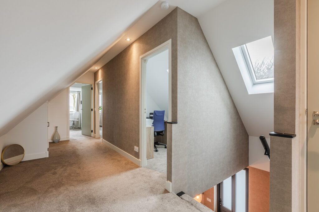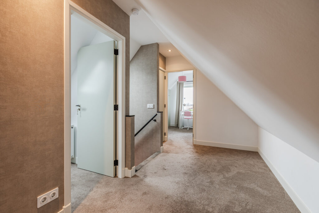 Op de eerste verdieping bevindt zich een ruime overloop, een tweede toilet en vier slaapkamers. Drie slaapkamers zijn voorzien van vaste kasten of praktische bergruimte. De kamers zijn flexibel in te delen als slaap-, werk- of hobbyruimte.