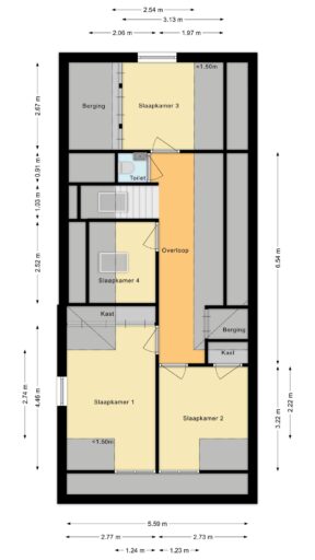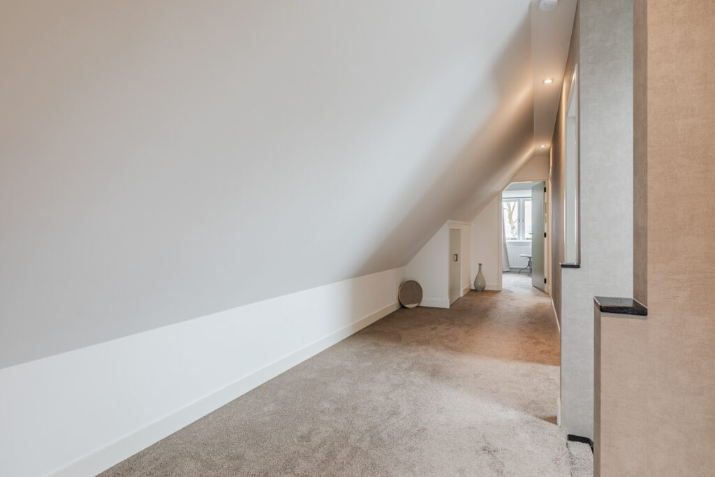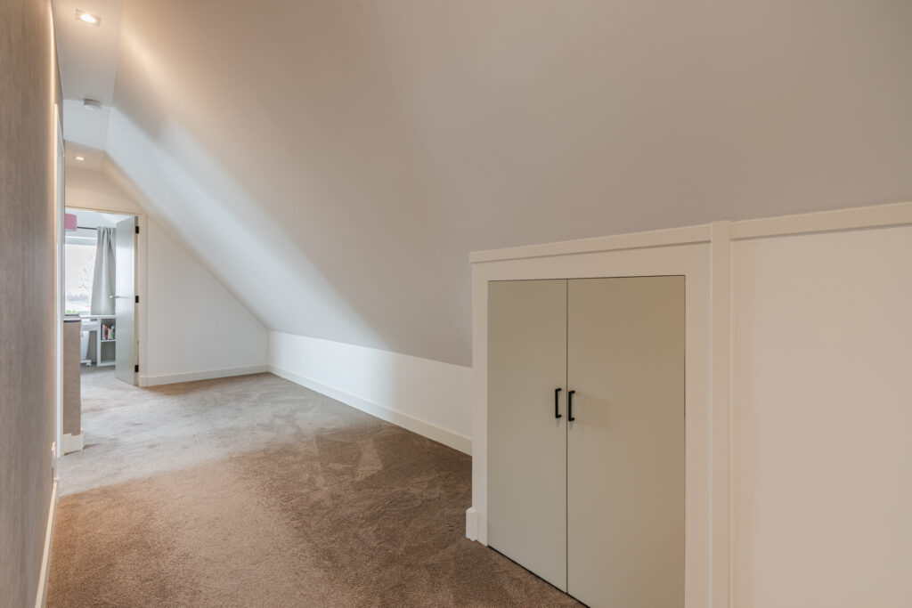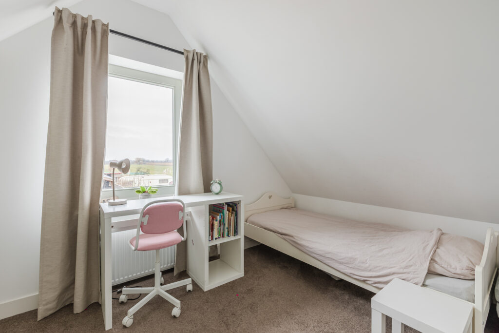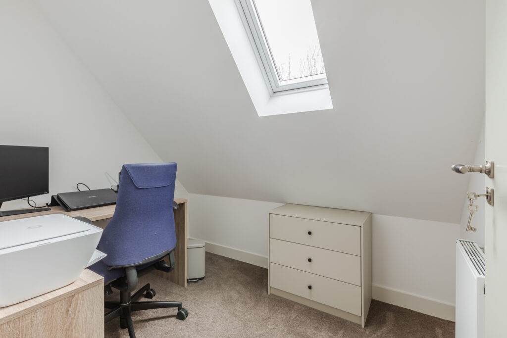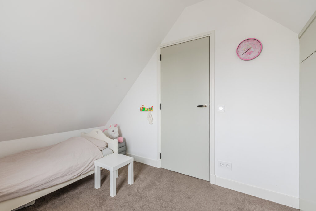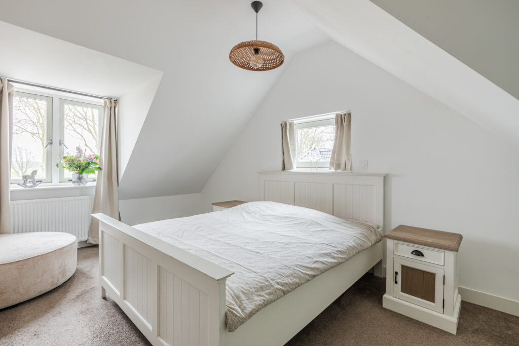 Op de eerste verdieping bevindt zich een ruime overloop, een tweede toilet en vier slaapkamers. Drie slaapkamers zijn voorzien van vaste kasten of praktische bergruimte. De kamers zijn flexibel in te delen als slaap-, werk- of hobbyruimte.