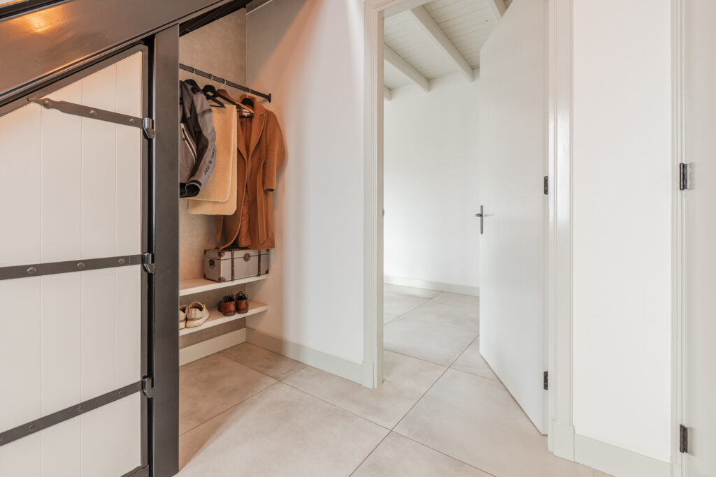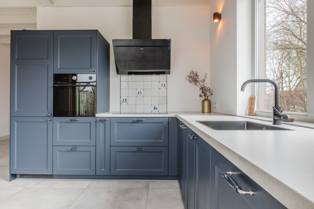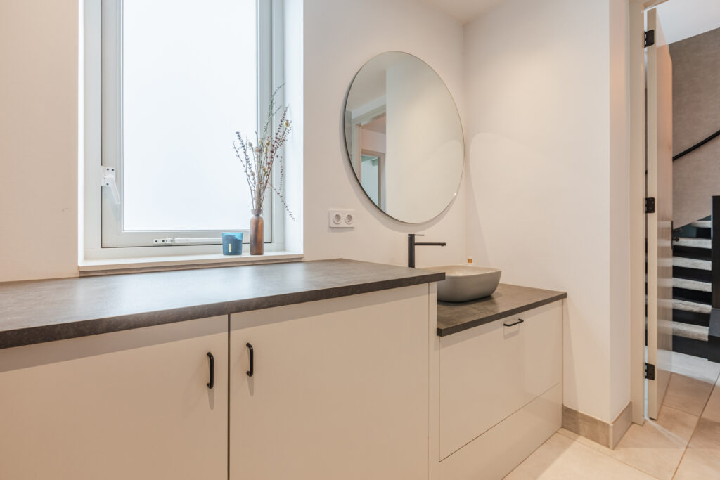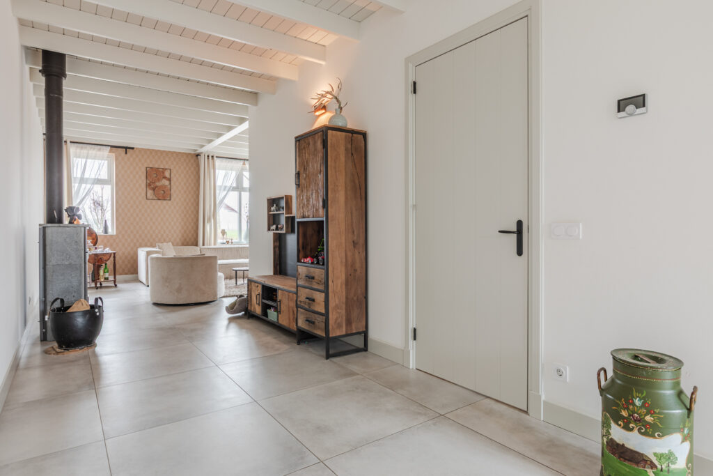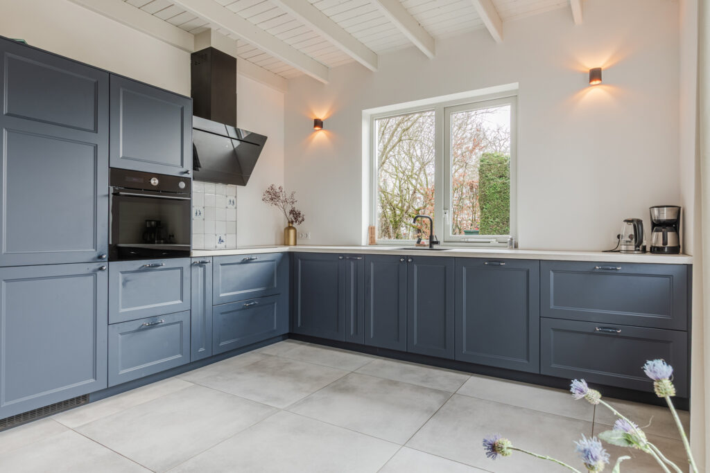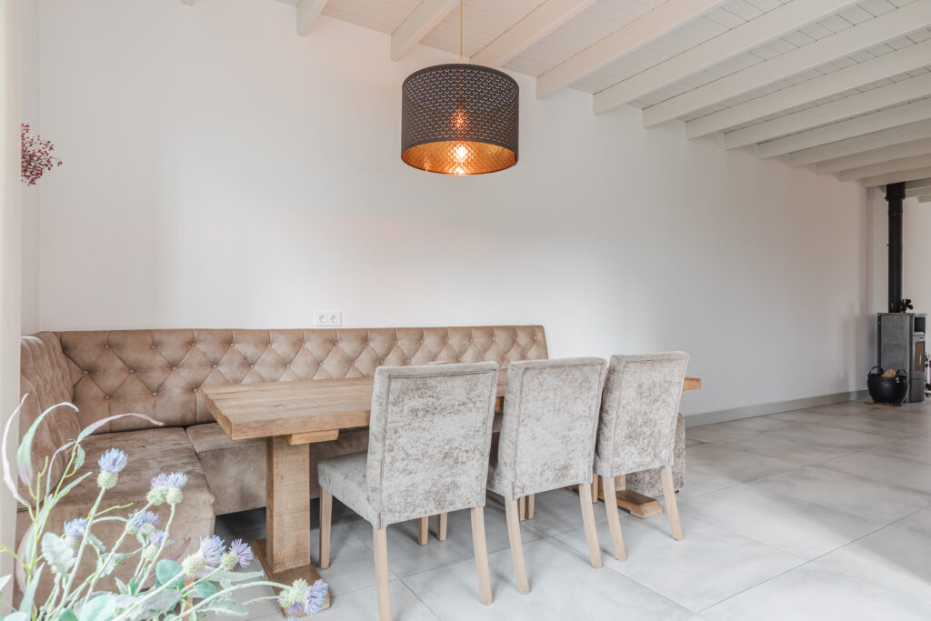 De keuken is volledig uitgerust met een inductiekookplaat, afzuigkap, combi-oven, koel-vriescombinatie en vaatwasser. Een eettafel past hier gemakkelijk, ideaal voor gezinsmaaltijden of diners met vrienden. Openslaande deuren verbinden de keuken direct met de tuin, waardoor binnen en buiten op een natuurlijke manier in elkaar overvloeien.