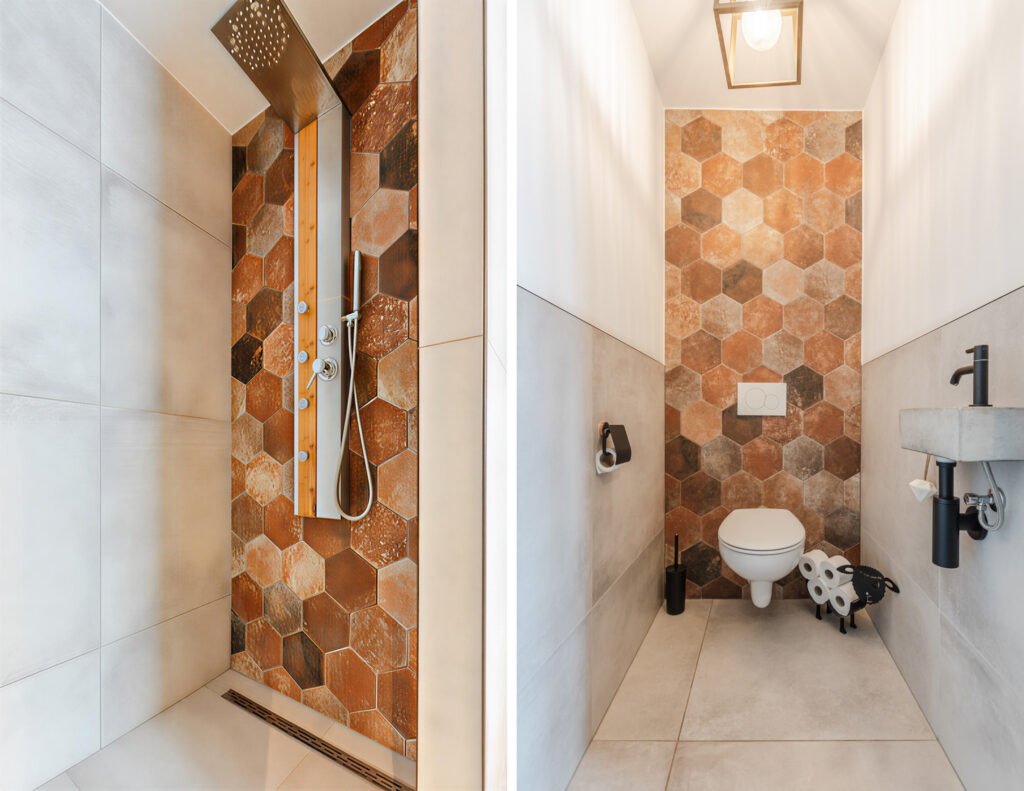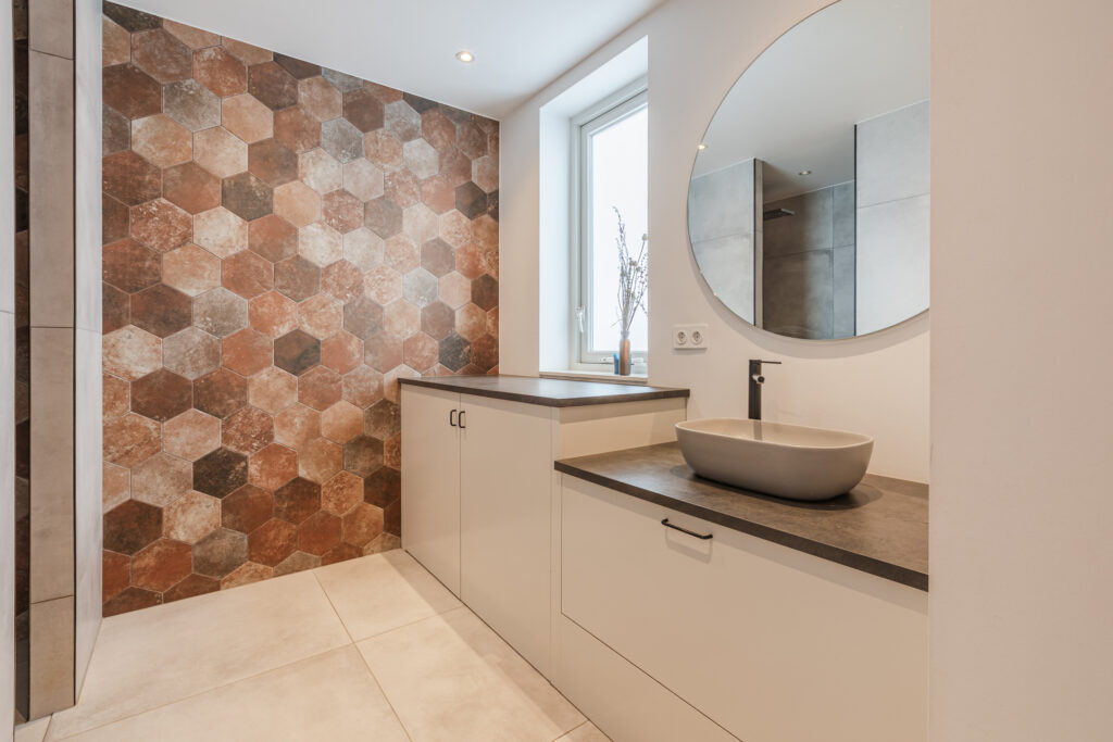 De badkamer op de begane grond is modern en eigentijds ingericht, met een stijlvol wastafelmeubel en een ruime inloopdouche.