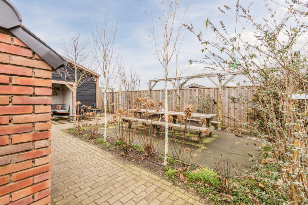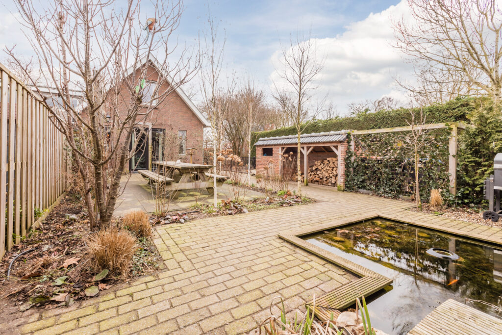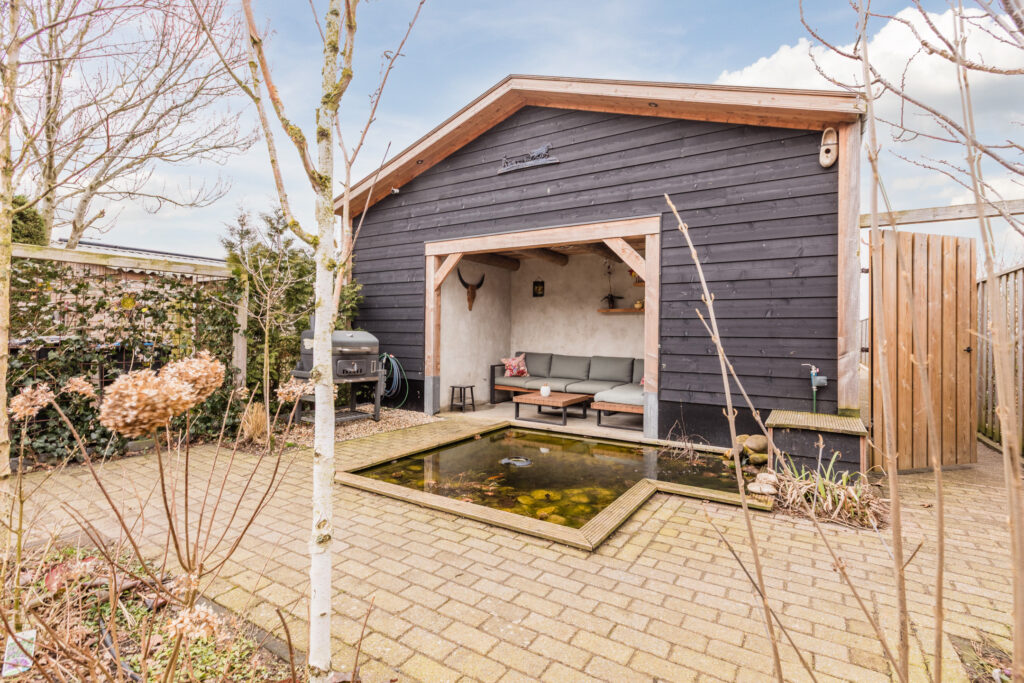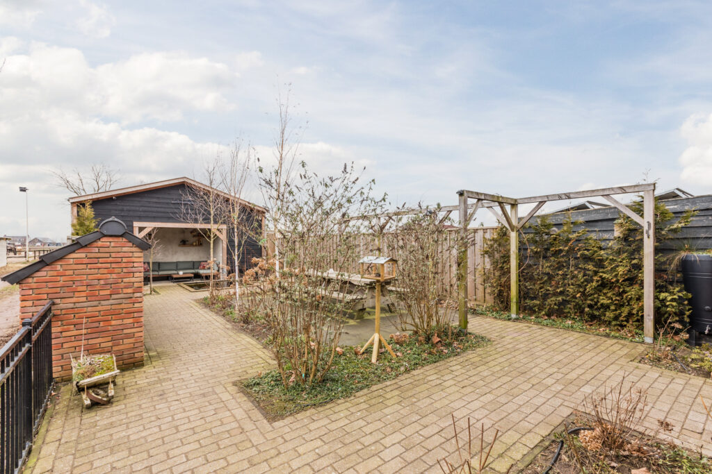 De achtertuin is groen en verzorgd aangelegd, met vaste beplanting, sierbeplanting, een vijver en een houthok. Een ruime veranda maakt het mogelijk om beschut buiten te zitten en te genieten van de zon of een rustige avond. Dankzij de lengte van het perceel is er volop ruimte voor kinderen om te spelen, voor het houden van dieren of voor het aanleggen van een moestuin.