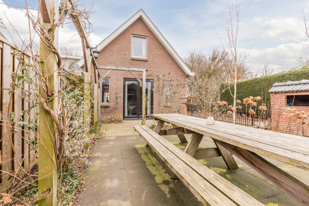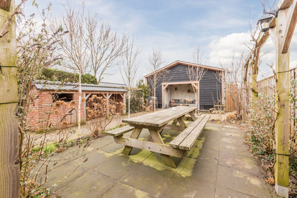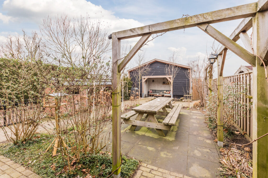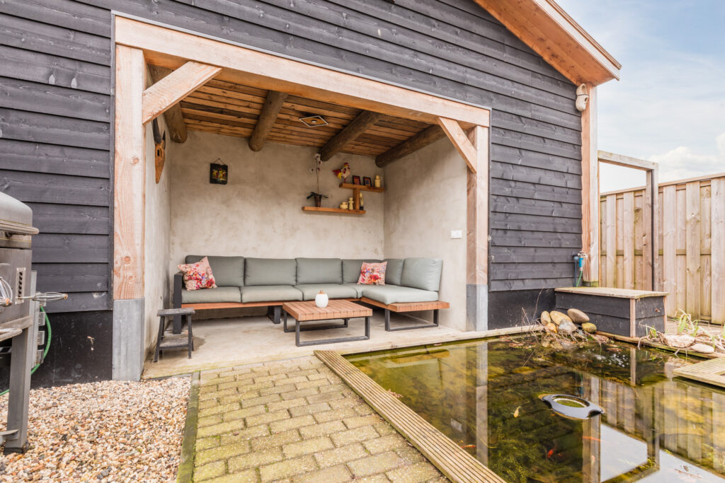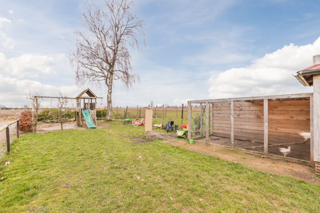 De achtertuin is groen en verzorgd aangelegd, met vaste beplanting, sierbeplanting, een vijver en een houthok. Een ruime veranda maakt het mogelijk om beschut buiten te zitten en te genieten van de zon of een rustige avond. Dankzij de lengte van het perceel is er volop ruimte voor kinderen om te spelen, voor het houden van dieren of voor het aanleggen van een moestuin.