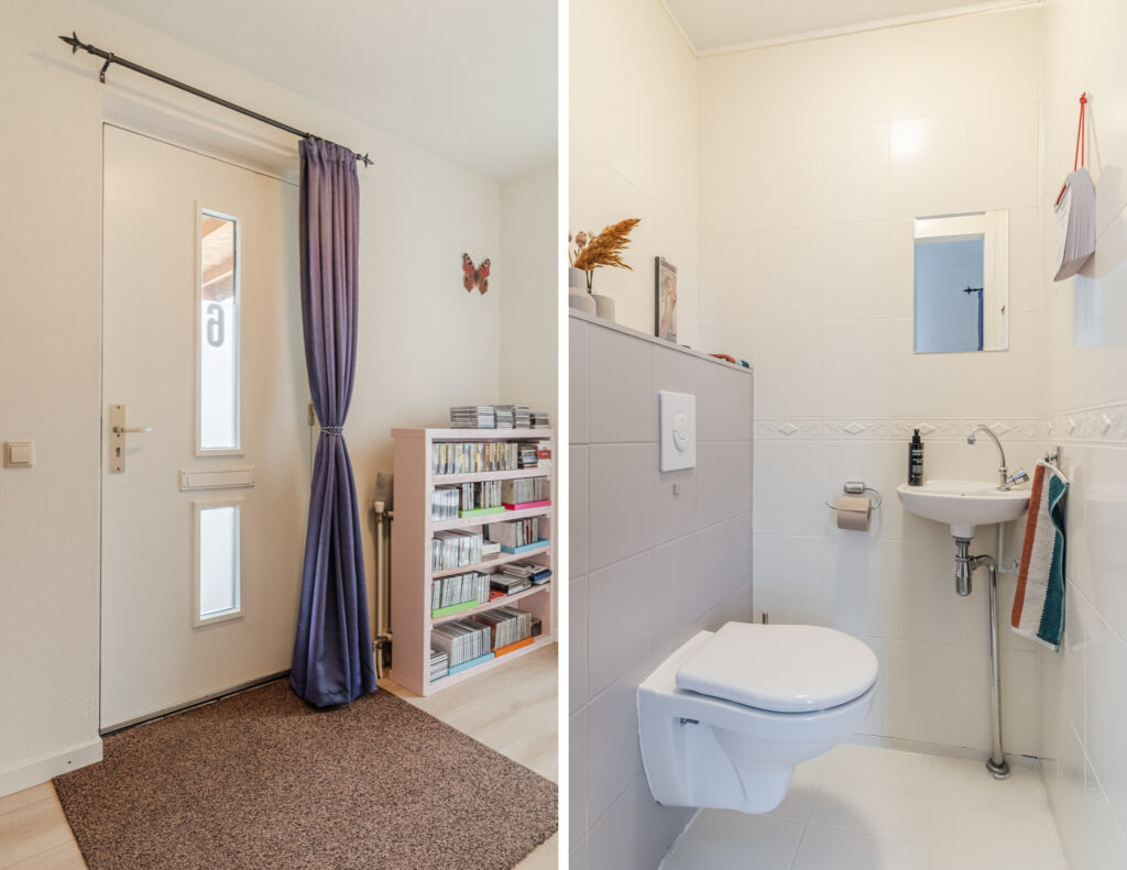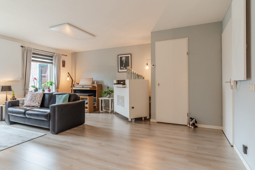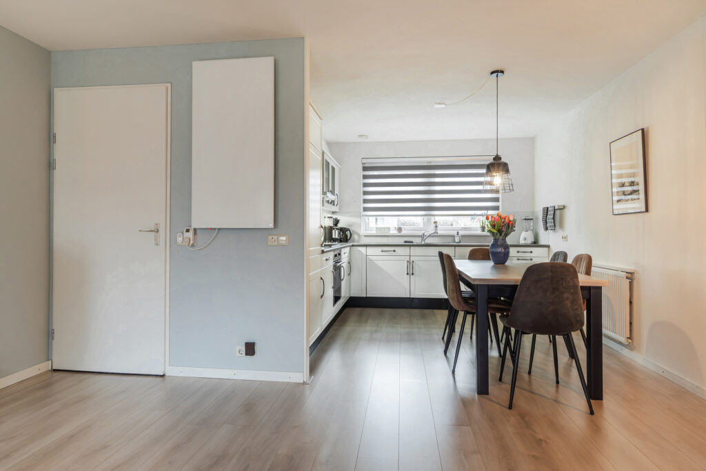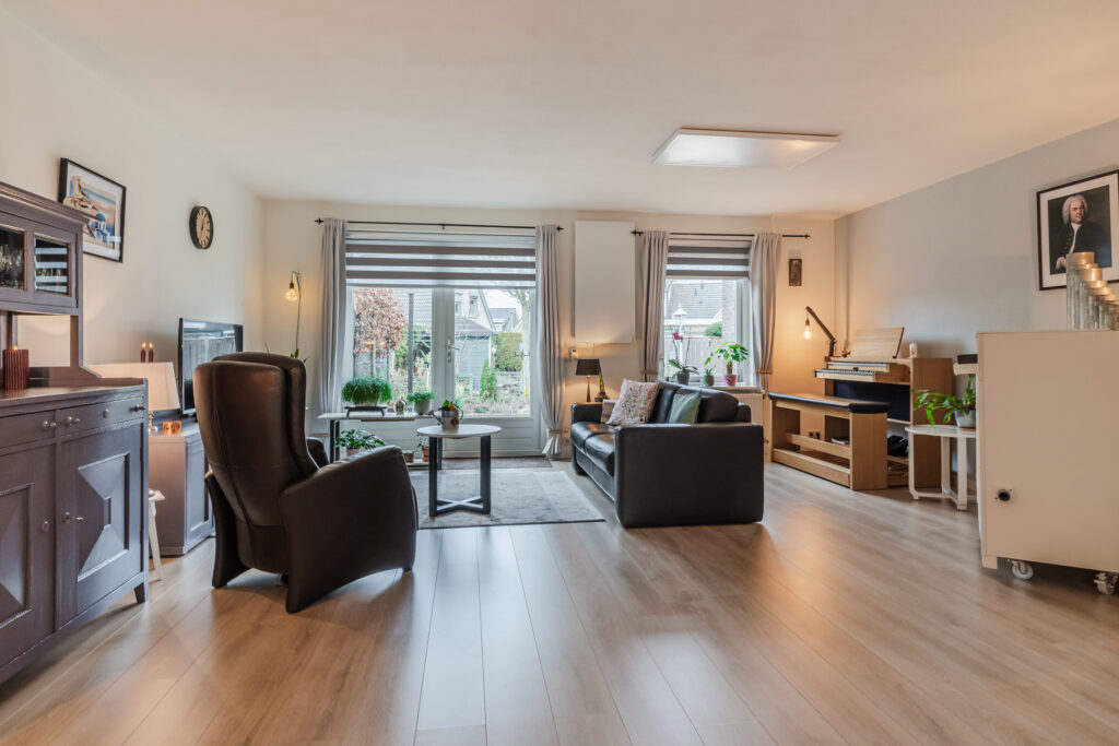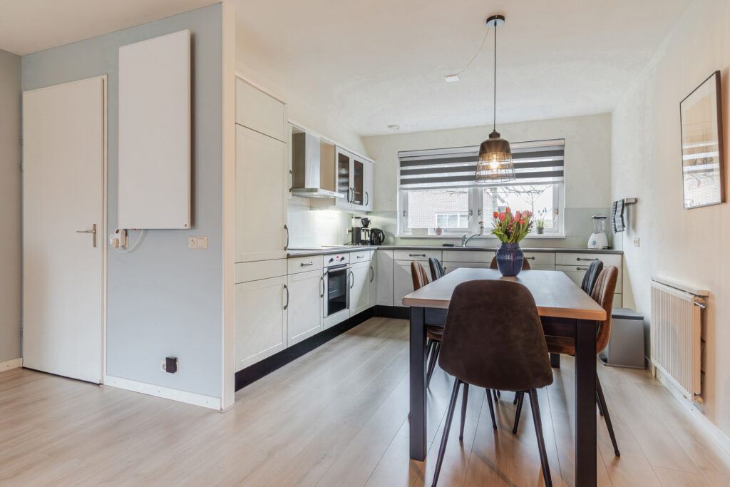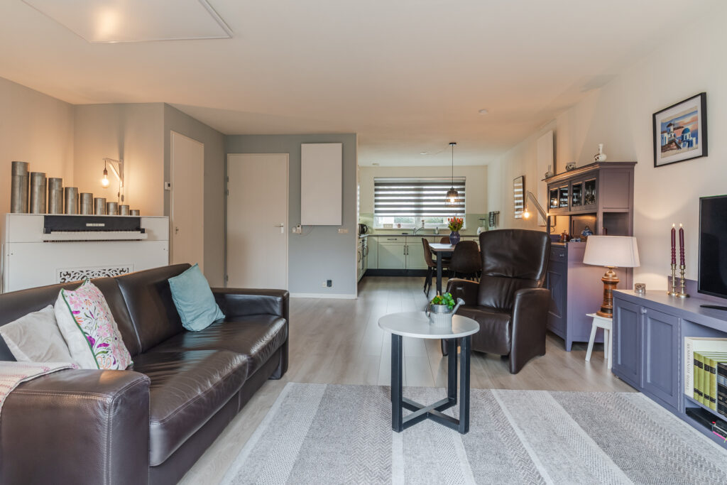 Via de entree/hal met toilet, meterkast en trapopgang bereik je de lichte en ruime woonkamer. De woonkamer beschikt over een praktische trapkast en openslaande tuindeuren naar de achtertuin, waardoor binnen en buiten mooi in elkaar overlopen. De open keuken is compleet uitgerust met een inductiekookplaat, afzuigkap, oven, koel-/vriescombinatie en vaatwasser.