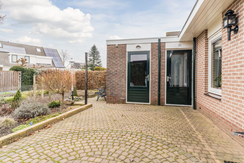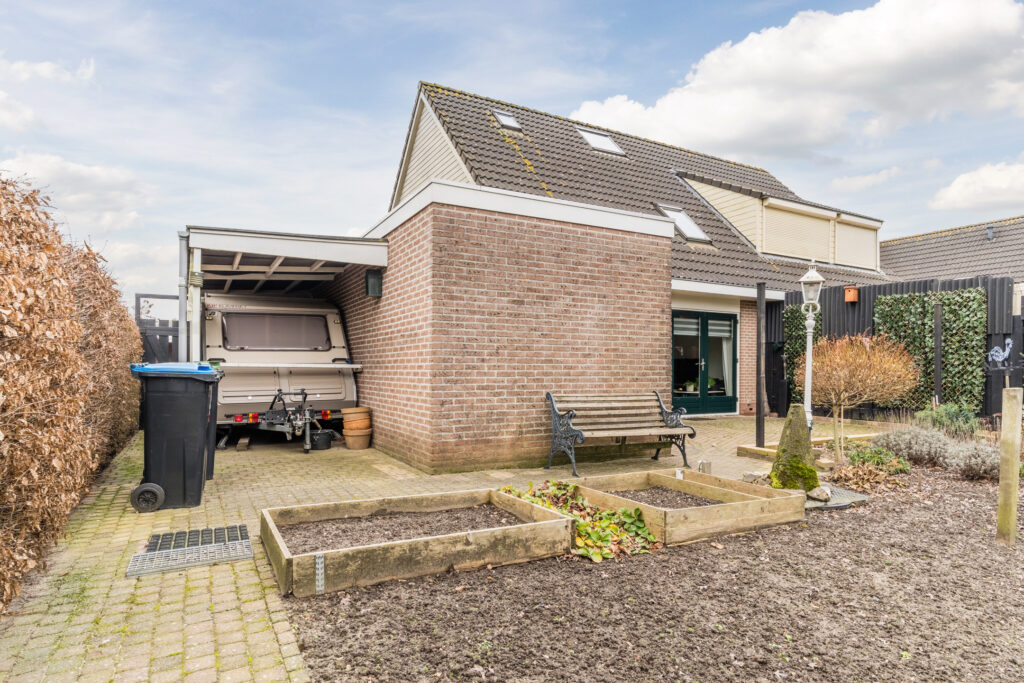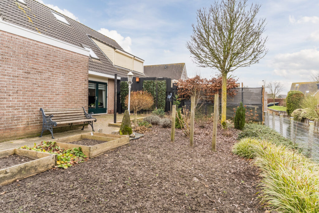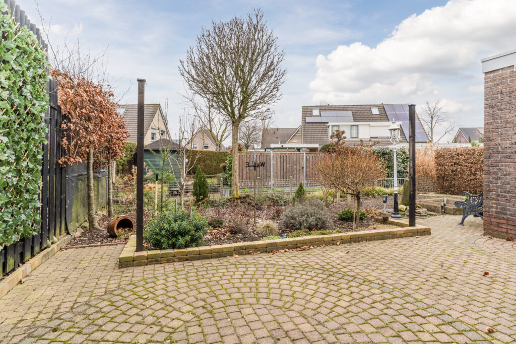 De royale tuin ligt op het noordwesten en grenst aan het water wat de mogelijkheid geeft om een bootje af te meren. De tuin is fraai aangelegd met vaste beplanting, berging, overkapping aan de zijkant van de woning en er is een achterom aanwezig. Parkeren van meerdere auto’s kan op eigen oprit met carport.