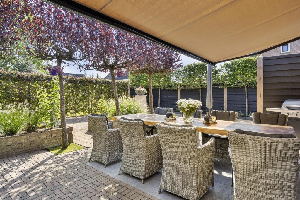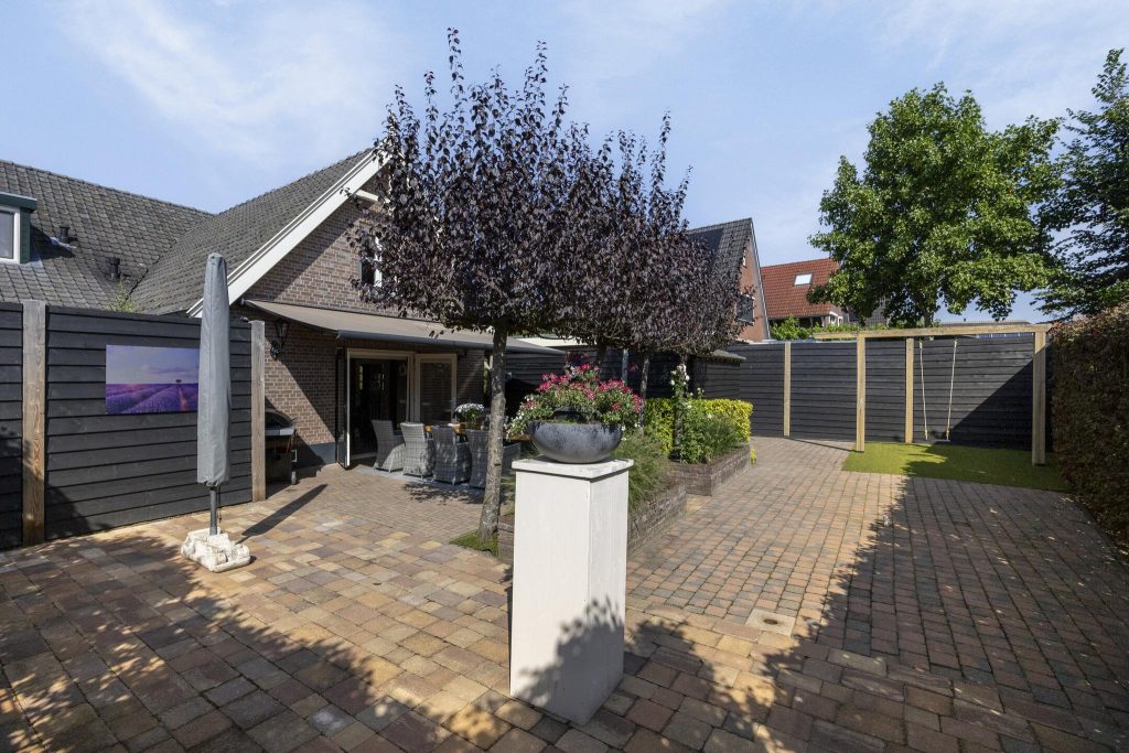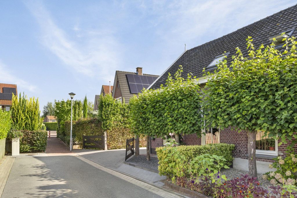 De voor-/achtertuin zijn verzorgd aangelegd met vaste beplanting, gazon, border met sierplanten en een zonneterras. De achtertuin is privacyvol gelegen op het oosten, wat betekent dat u kunt genieten van de ochtendzon. Daarnaast is er een vrijstaande berging aanwezig voor extra bergruimte. De woning beschikt over een brede oprit met overkapping, waar voldoende ruimte is voor het parkeren van meerdere auto’s.