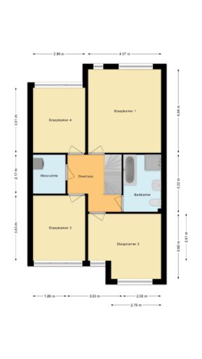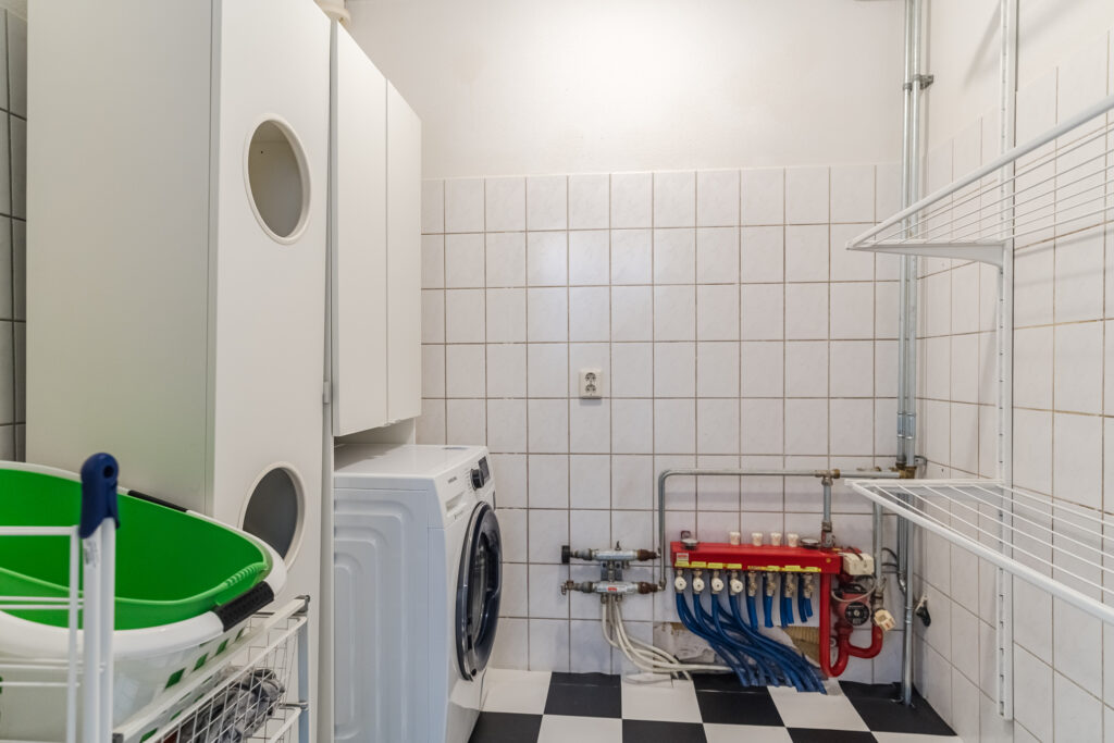 De overloop geeft toegang tot vier royale slaapkamers en de trap naar de tweede verdieping. Daarnaast bevindt zich hier een praktische wasruimte en een complete badkamer met ligbad, douche, toilet en wastafel.