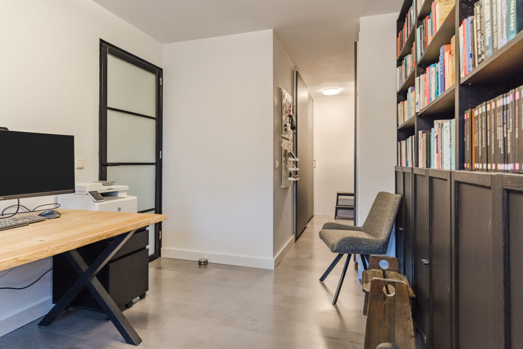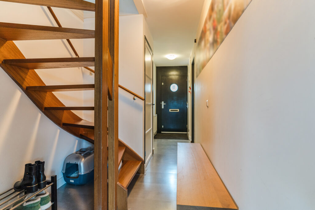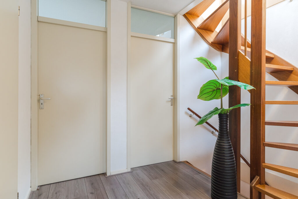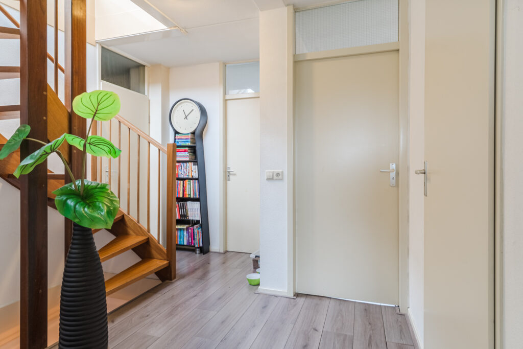 Via de oprit bereik je de entree van de woning. In de hal bevinden zich de meterkast, toilet (2022) met fonteintje en de trapopgang naar de eerste verdieping. Vanuit de hal is er toegang tot een werk-/kantoorruimte met diverse vaste kasten. Deze ruimte is multifunctioneel en kan desgewenst eenvoudig worden omgevormd tot een slaapkamer. Daarnaast is er een praktische inpandige berging, ideaal voor extra opslagruimte.