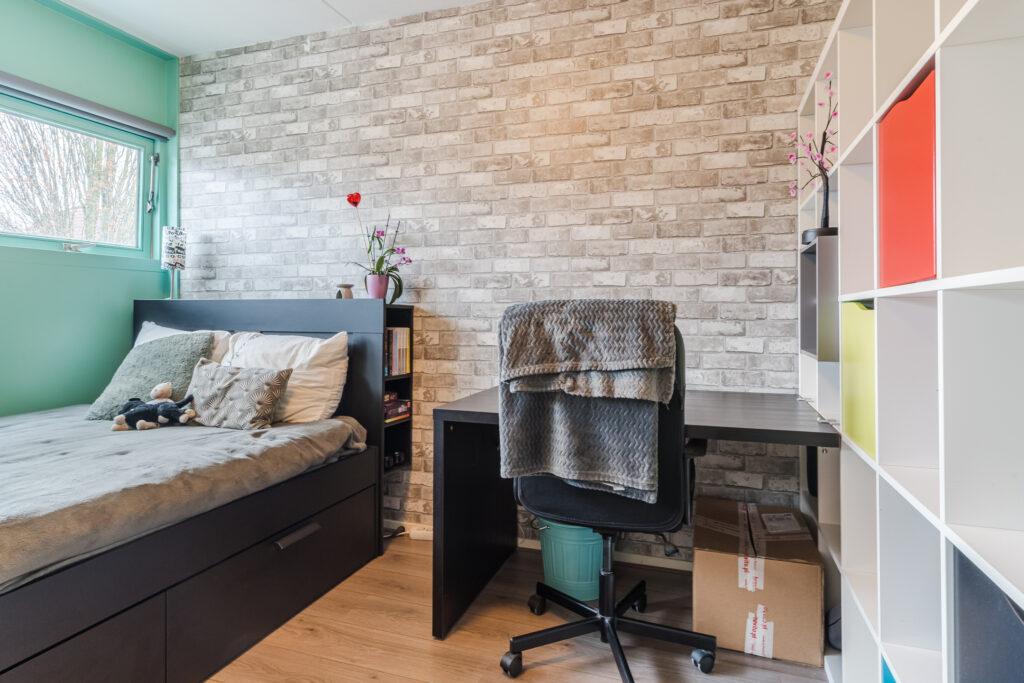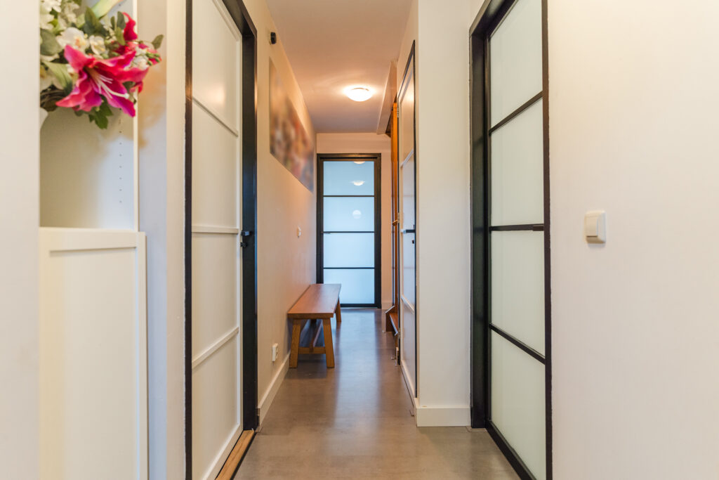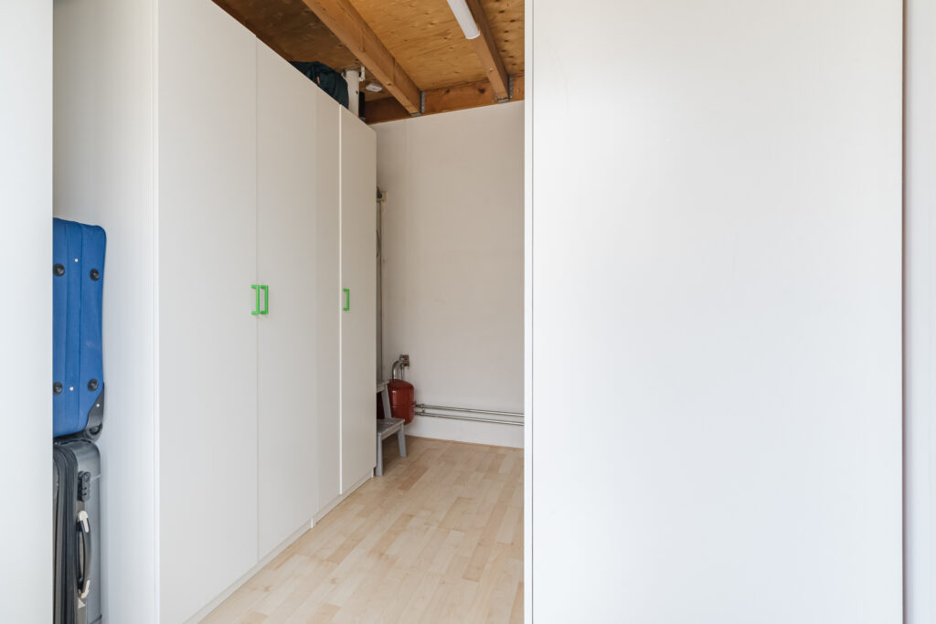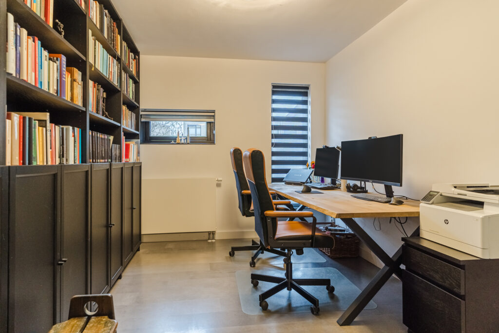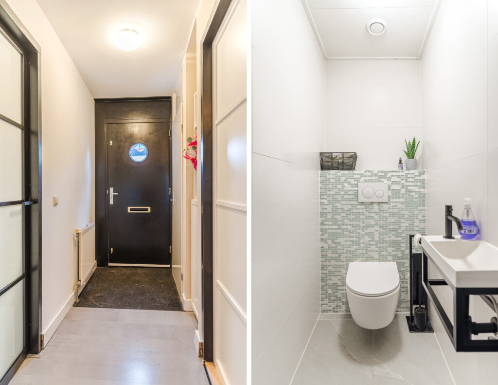 Via de oprit bereik je de entree van de woning. In de hal bevinden zich de meterkast, toilet (2022) met fonteintje en de trapopgang naar de eerste verdieping. Vanuit de hal is er toegang tot een werk-/kantoorruimte met diverse vaste kasten. Deze ruimte is multifunctioneel en kan desgewenst eenvoudig worden omgevormd tot een slaapkamer. Daarnaast is er een praktische inpandige berging, ideaal voor extra opslagruimte.