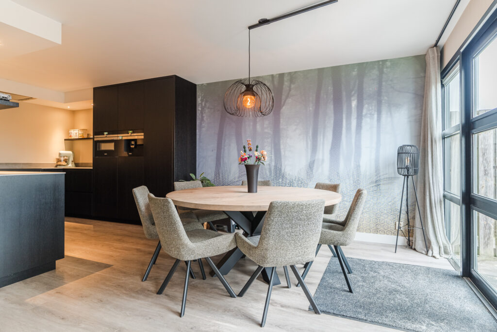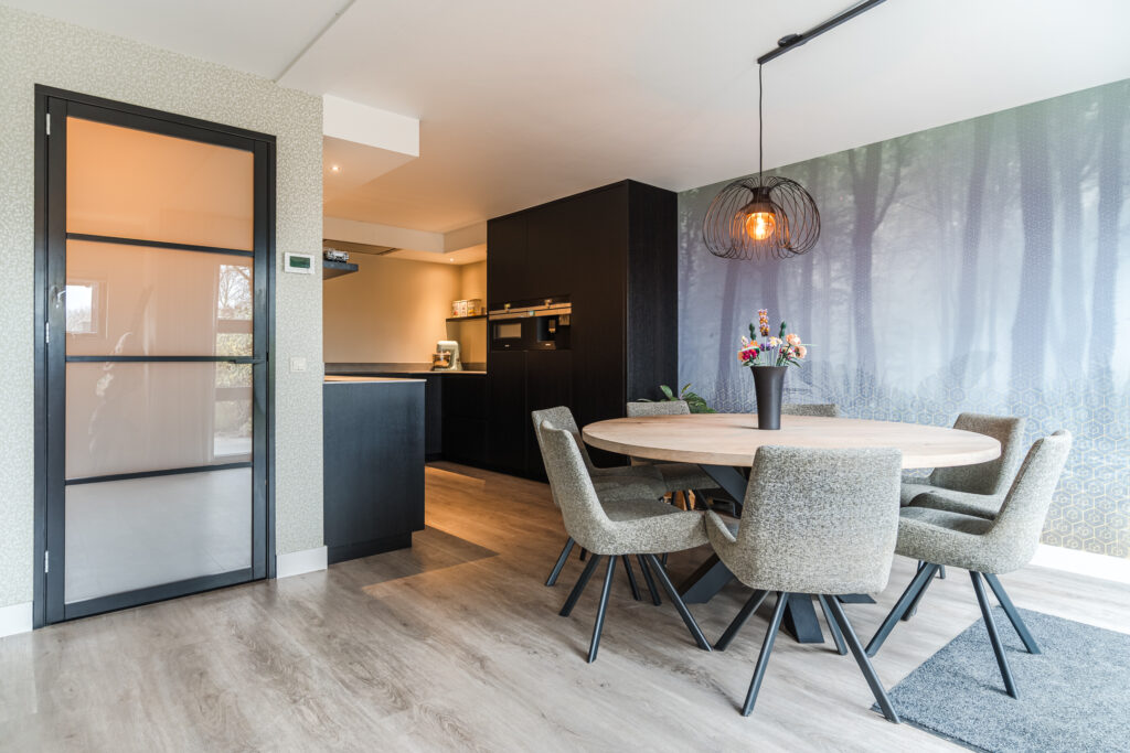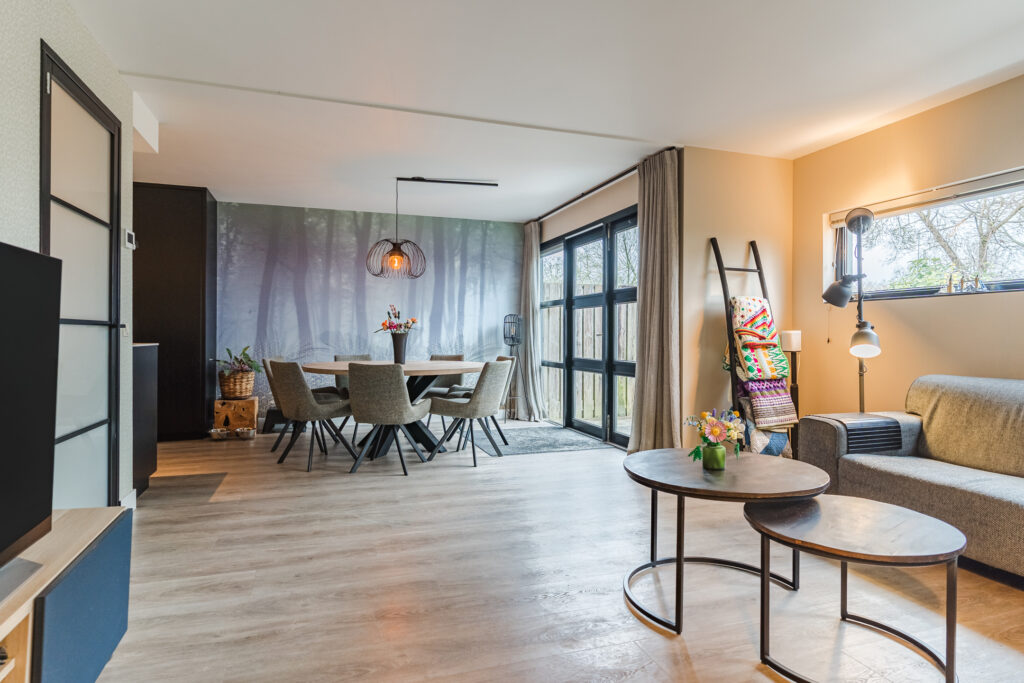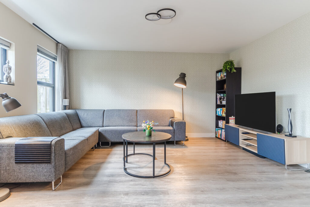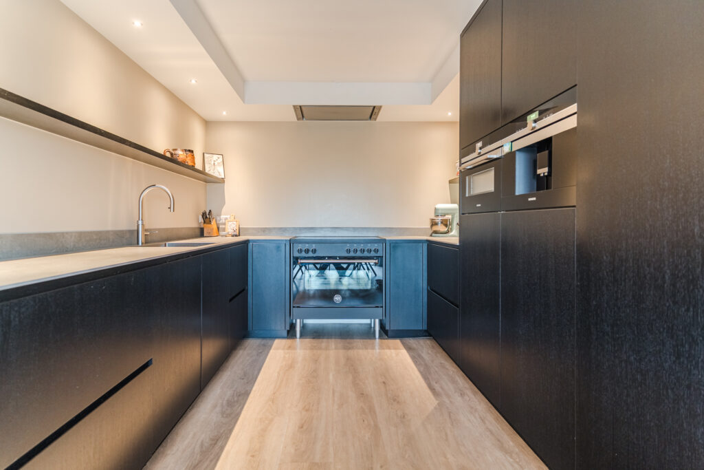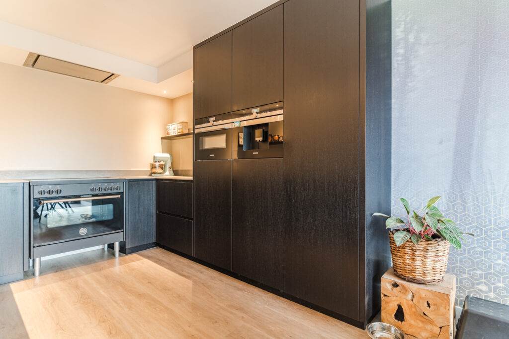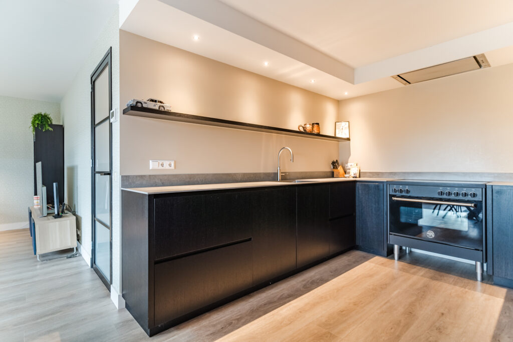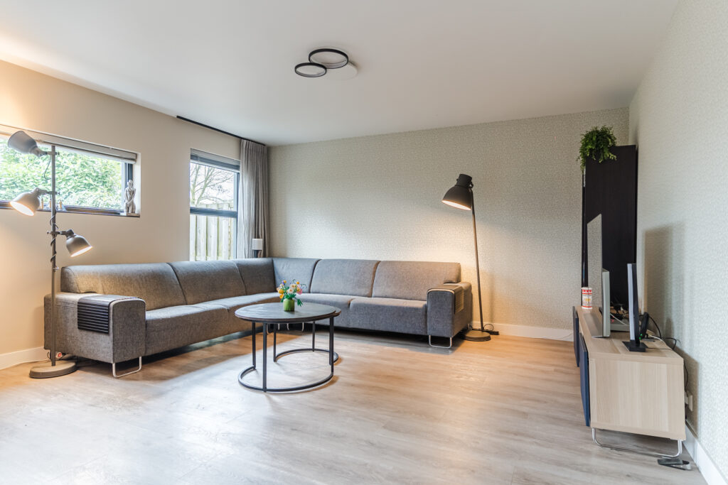 Aan de achterzijde van de woning bevindt zich de ruime woonkamer met een fijne lichtinval. De woonkamer staat in open verbinding met de royale moderne keuken (2022). De keuken luxe is voorzien van diverse inbouwapparatuur, waaronder een inductiekookplaat, afzuigkap, combi-oven, oven, koelkast, vriezer, vaatwasser, Quooker en een koffiezetapparaat. Vanuit de keuken is er een achterentree naar de tuin. De woonkamer en keuken zijn beide voorzien van comfortabele vloerverwarming.